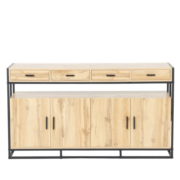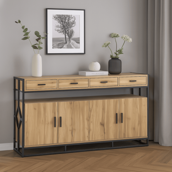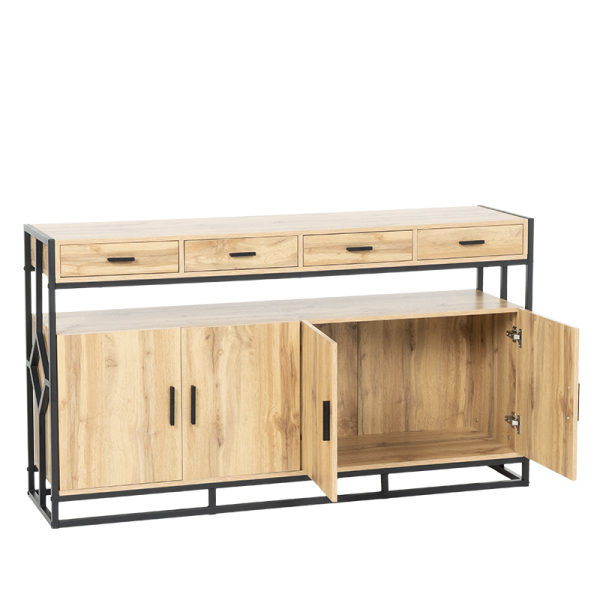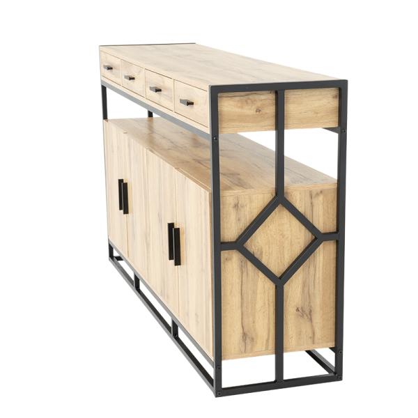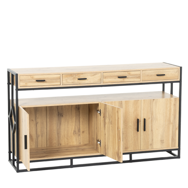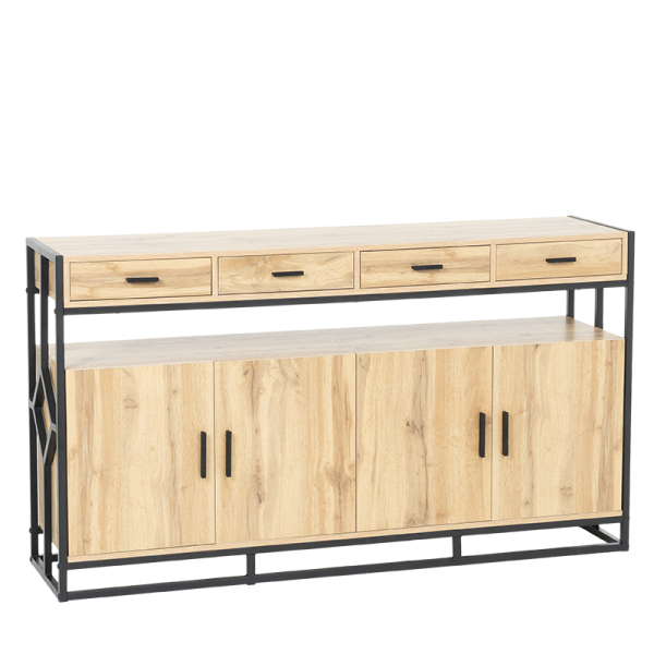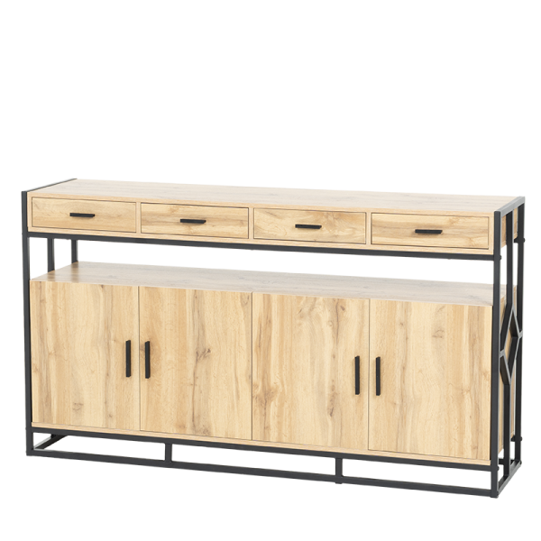 Скрин SKANOR е стилен акцент за всеки модерен интериор. Съчетава здрава черна метална основа с ефектна визия в дъб вотан – МДФ плоскости с меламиново покритие и дебелина 15 мм. Моделът впечатлява с балансиран дизайн и практичност – разполага с 4 чекмеджета и 2 шкафа, които осигуряват изобилие от място за подредба и съхранение.