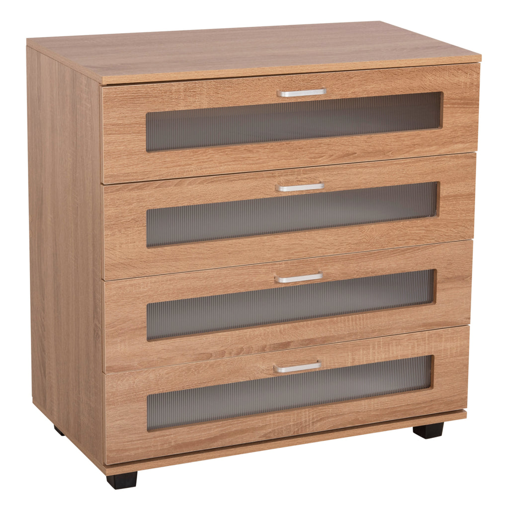 THORGAN е голям скрин с 4 широки чекмеджета, който ще задоволи всички ваши нужди. Има неутрален цвят SONOMA със сребристи дръжки. Характеристиката, която отличава този скрин е, че чекмеджетата имат прозорци от полупрозрачно поликарбонатно стъкло. Черните крака на скрина са стабилни и широки, придават здравина на конструкцията и в същото време създават приятен двуцветен цвят с основното тяло на скрина. РАЗМЕРИ: 80X40X83H cm МАТЕРИАЛИ НА ИЗРАБОТКА: Краката на скрина са изработени от подсилен полипропилен. Полипропиленът е особено устойчив на тегло и вода, като същевременно има голяма устойчивост на температури до 125 градуса по Целзий. Освен това неговата издръжливост не се ограничава до тегло, вода и температура, но е необичайно устойчив на много химически разтворители, киселини и основи. Цялата мебел е изработена от качествен 15мм меламин. Меламинът е вид дървесина под формата на ПДЧ. ПДЧ са продукти, които имат формата на плоча (панел). Това е синтетичен материал с много твърда повърхност, което го прави много устойчив на драскотини, абразия и петна. ПОДДРЪЖКА: Меламинът, който е строителният материал, се почиства много лесно от петна благодарение на твърдата си повърхност. Можете да забършете всички повърхности с влажна кърпа и това е достатъчно, за да изглеждат вашите мебели отново като нови. За упорити петна можете да използвате мек почистващ препарат. ПРЕДИМСТВА: Скринът е точно това, което очаквате. Удобна и стабилна конструкция с качествена конструкция. Сглобяването е лесно и инструкциите за сглобяване се доставят с опаковката. Фактът, че скринът има фиксирани крака, го прави много издръжлив и ви дава възможност да използвате горната повърхност без страх за всичко, което пожелаете. И всичко това с най-доброто съотношение качество-цена на пазара. *Продуктът се доставя във фабрична опаковка **Точното цветопредаване на продукта може леко да се различава от действителния продукт поради различните настройки на всеки монитор.