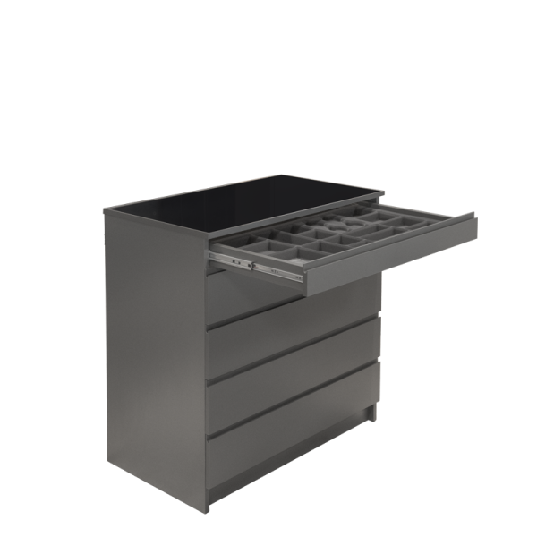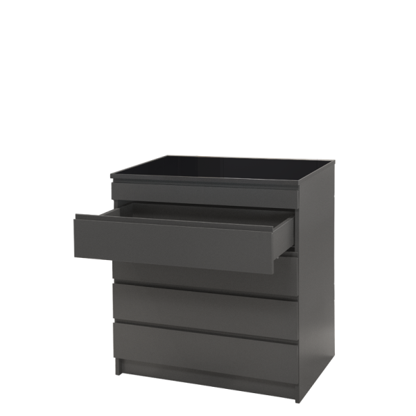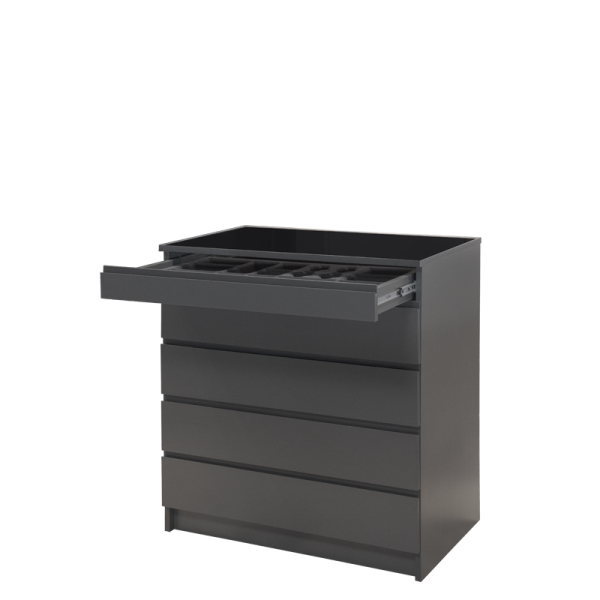 Изискан и практичен, скринът YORK е изработен от висококачествено ПДЧ с дебелина 18 мм в елегантен графитен цвят. Разполага с пет просторни чекмеджета с механизъм за плавно затваряне, като най-горното е снабдено с практичен органайзер за колани, часовници и аксесоари. Завършен с плот от опушено стъкло с огледален ефект, той не само придава стилен акцент, но и ви позволява да изберете желания аксесоар, преди дори да отворите чекмеджето.