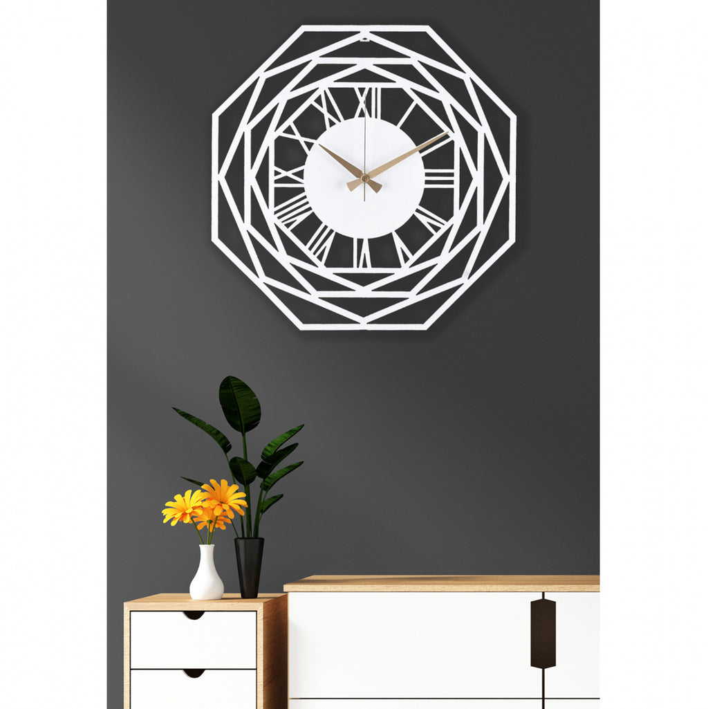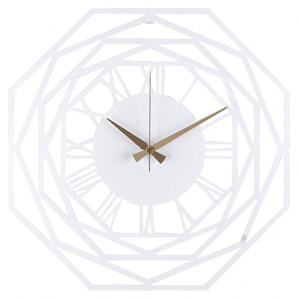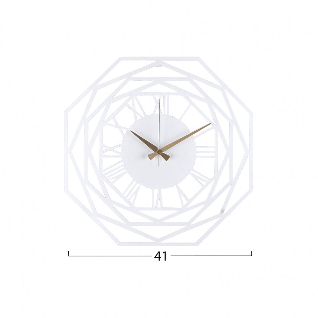 Бял стенен часовник. Можете да украсите стената си с часовник с несравнима естетика и високо качество. Той е идеалният подарък, който допълва декорацията на офиса, дома и всяко интериорно пространство (с изключение на банята). Изработен от метален материал с дебелина 1,2 мм, той има лъскава текстура и бяла метална статична боя, като стрелките също са в цвят металик. Особеност на часовника е безшумният му механизъм. Батерията не е включена в пакета. Продуктът се намира на 2,5 см от стената. Лесно се фиксира с един пирон. Размери: 41х41см.
