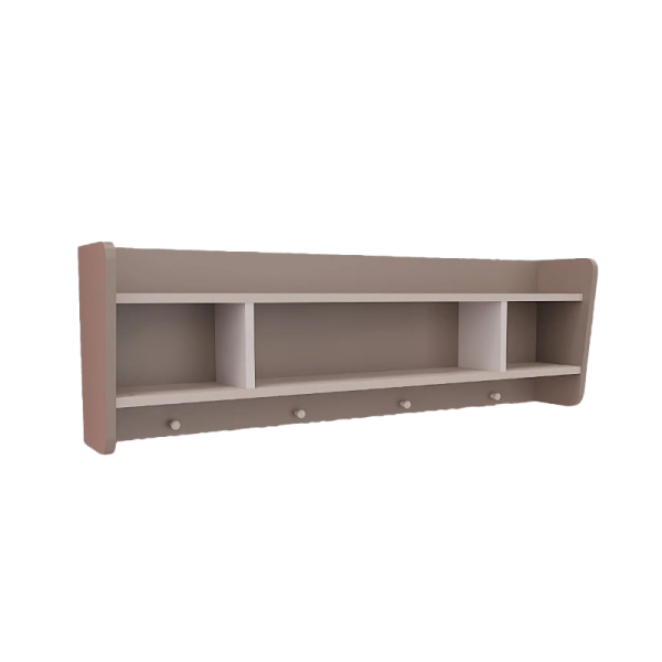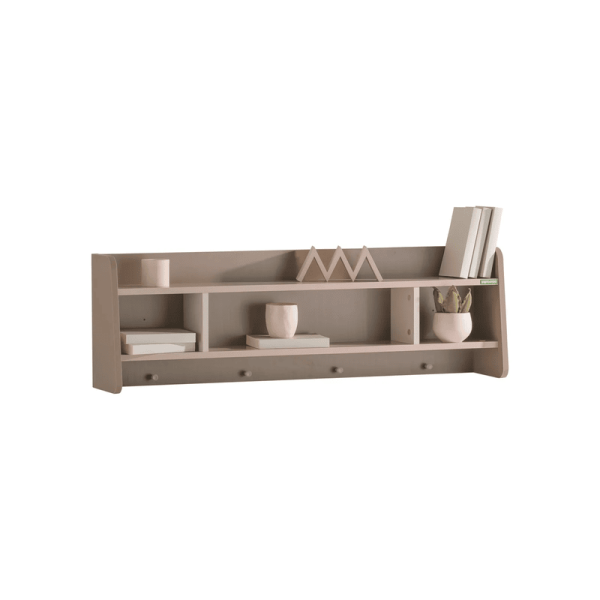 Стенният рафт със закачалка RIGA съчетава елегантен дизайн и практична функционалност в едно. Разполага с два удобни рафта за книги, декорации или аксесоари, както и с четири дървени куки, подходящи за чанти, дрехи или раници. Изработен е от висококачествено ПДЧ с дебелина 18 мм и е идеално допълнение към детската стая от серията RIGA.