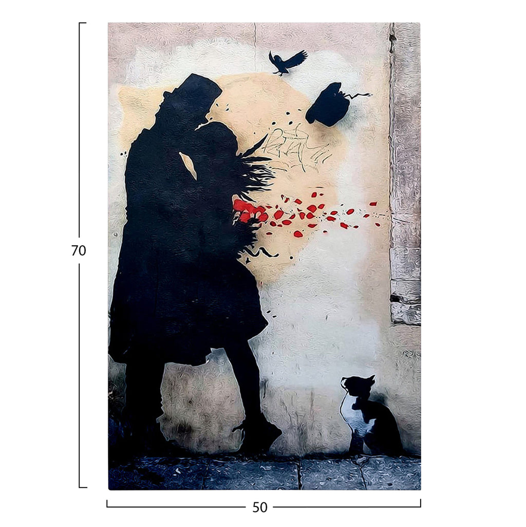 Стенописът трансформира начина, по който възприемаме пространството. И така, украсете вашето пространство с новата серия картини за стена GOBI! Тази черно-бяла картина, изобразяваща двойка на улицата (улично изкуство), е реализирана върху дигитално отпечатано платно (50% памук-50% полиестер) върху дървена рамка. (Дизайнер: Kenny Random) РАЗМЕРИ: 50x3(дебелина)x70H cm Рамка: 2x3 cm ГРИЖИ: Почистете от прах, когато е необходимо. Не използвайте вода или химически почистващи препарати. ** Цветопредаването на продукта може леко да се различава от неговото фотографско представяне на вашия екран.