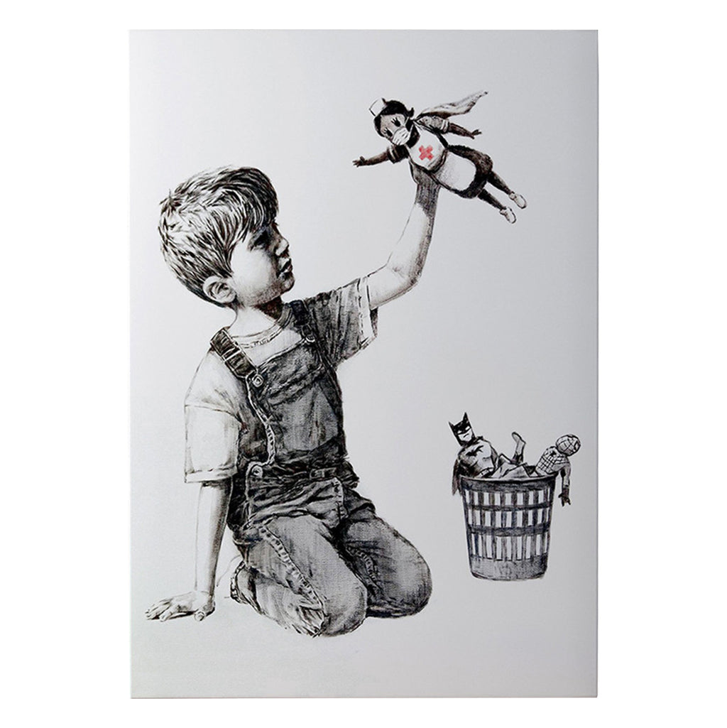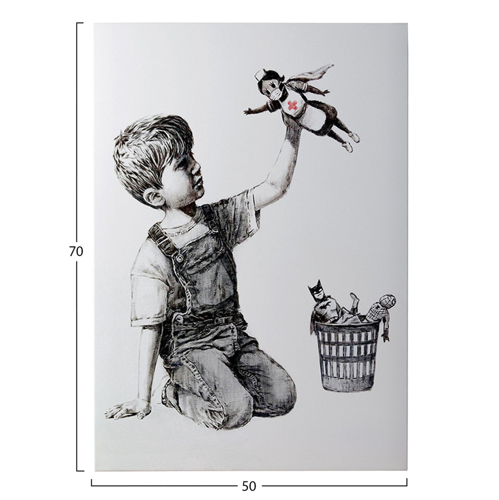 Стенописът трансформира начина, по който възприемаме пространството. И така, украсете вашето пространство с новата серия картини за стена GOBI! Тази черно-бяла картина на момче, което играе с играчките си, е реализирана върху дигитално отпечатано платно (50% памук-50% полиестер) върху дървена рамка. (Дизайнер: Banksy) РАЗМЕРИ: 50x3(дебелина)x70H cm. Рамка: 2х3 см. ГРИЖА: Почистване от прах при нужда. Не използвайте вода или химически почистващи препарати. ** Цветопредаването на продукта може леко да се различава от неговото фотографско представяне на вашия екран.