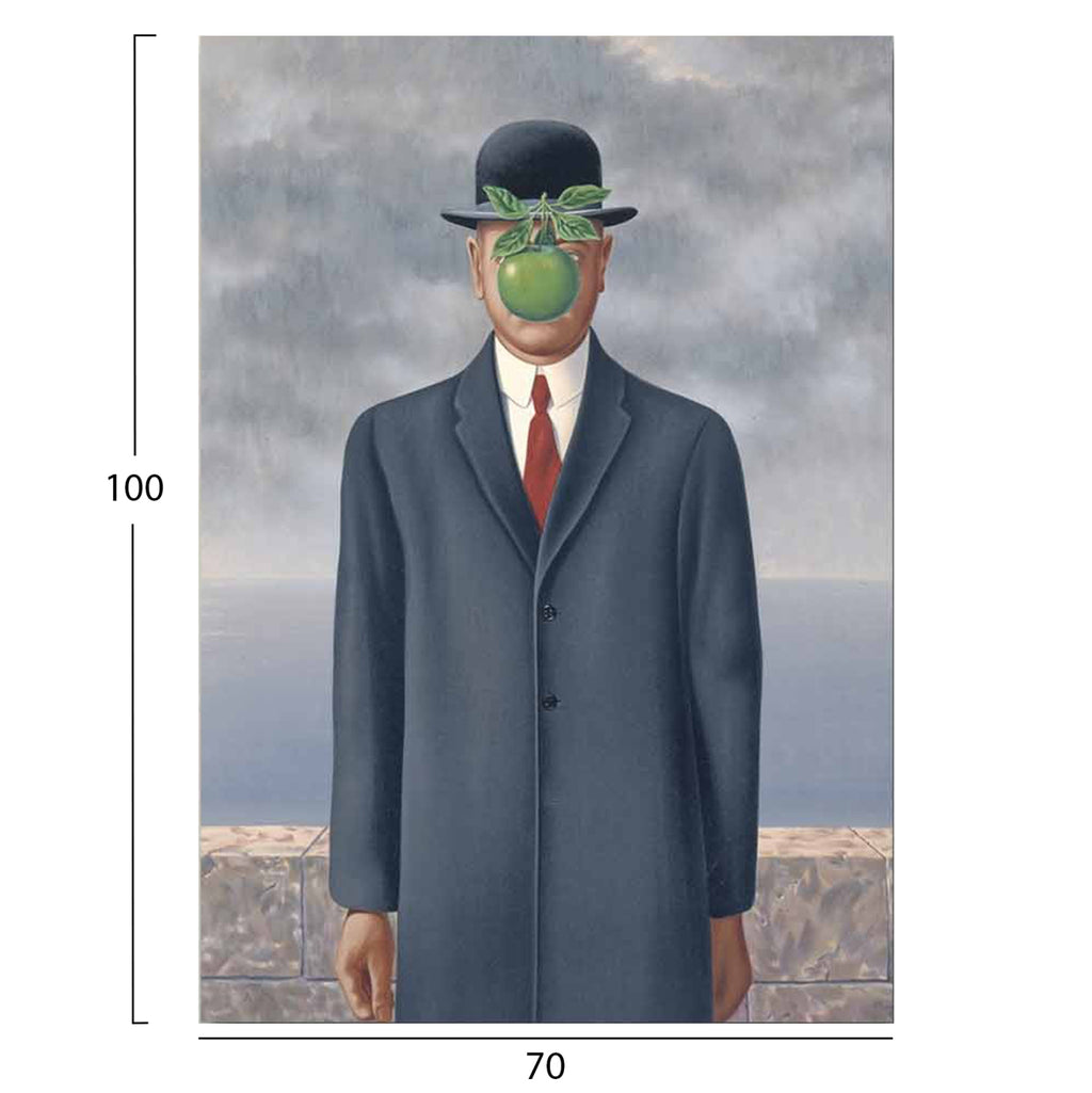 Стенописът трансформира начина, по който възприемаме пространството. Така че, украсете вашето пространство с нашата нова серия картини за стена GOBI! Тази картина, изобразяваща мъж с цилиндър и ябълка, е реализирана върху щамповано платно от ВЕЛУР с дървена рамка. (--Дизайнер: Rene Magritte) РАЗМЕРИ: 70x3(дебелина)x100H cm ГРИЖИ: Почистете от прах, когато е необходимо. Не използвайте вода или химически почистващи препарати. ** Цветопредаването на продукта може леко да се различава от неговото фотографско представяне на вашия екран.