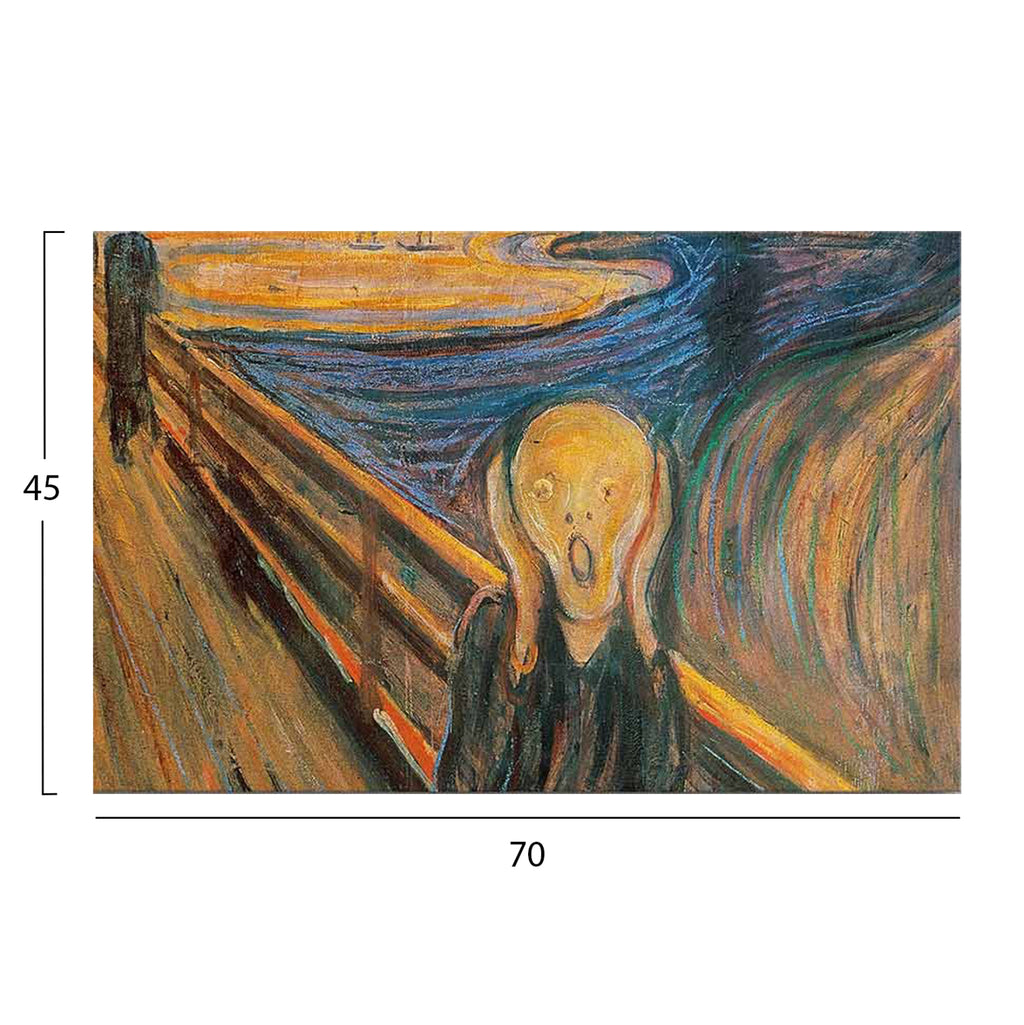 Стенописът трансформира начина, по който възприемаме пространството. Така че, украсете вашето пространство с нашата нова серия картини за стена GOBI! Тази класическа картина, изобразяваща сюрреалистична моментна снимка, е реализирана върху платно от велур с дървена рамка. (--Създател: Едвард Мунк) РАЗМЕРИ: 70x3(дебелина)x45H cm ГРИЖА: Избършете праха, когато е необходимо. Не използвайте вода или химически почистващи препарати. ** Цветопредаването на продукта може леко да се различава от неговото фотографско представяне на вашия екран.