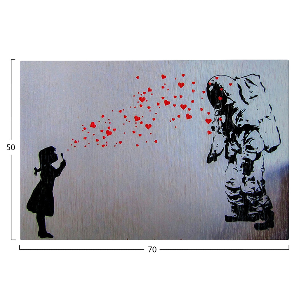 Стенописът трансформира начина, по който възприемаме пространството. И така, украсете вашето пространство с новата серия картини за стена GOBI! Тази черно-бяла картина на момиче, изпращащо червени сърца на астронавт, е реализирана върху дигитално отпечатано платно (50% памук-50% полиестер) върху дървена рамка. (Създаден от: Banksy) РАЗМЕРИ: 70x3(дебелина)x50H cm Рамка: 2x3 cm ГРИЖИ: Почистване от прах, когато е необходимо. Не използвайте вода или химически почистващи препарати. ** Цветопредаването на продукта може леко да се различава от неговото фотографско представяне на вашия екран.
