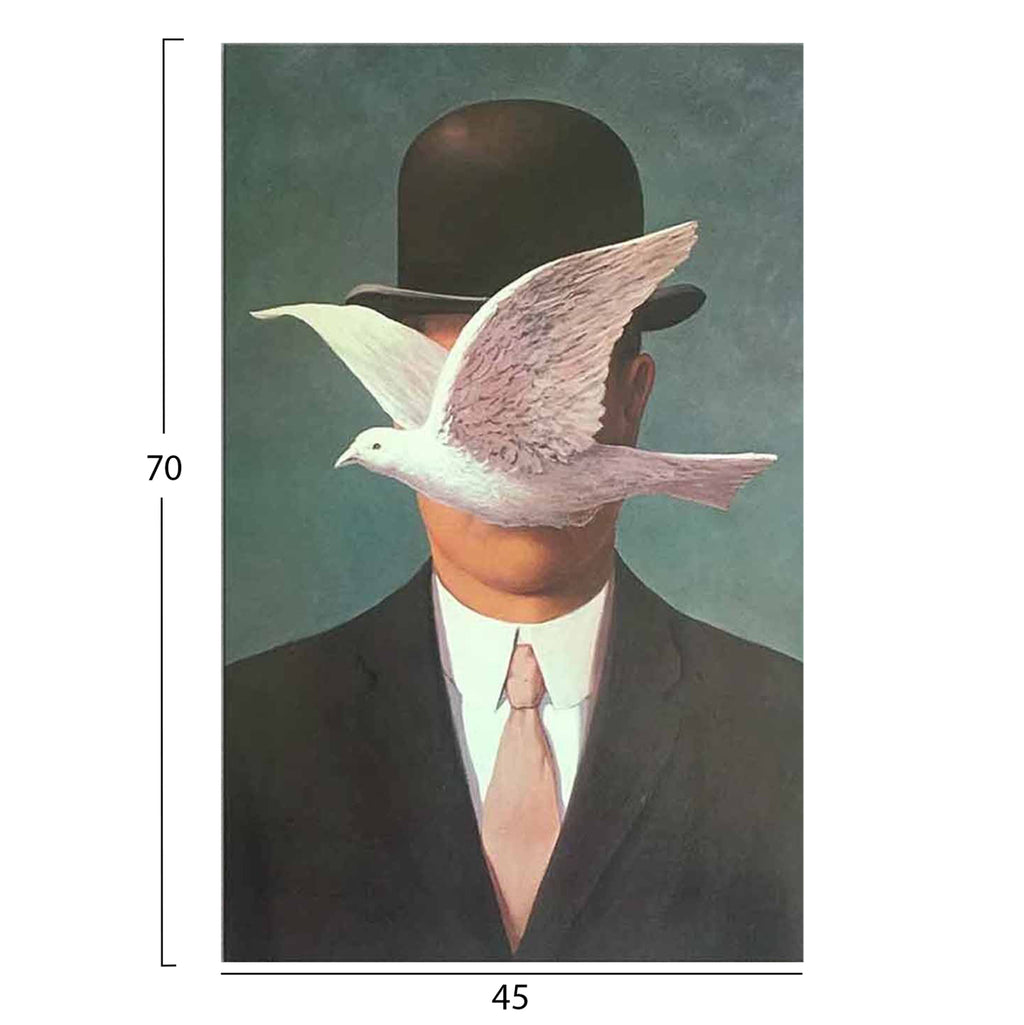 Стенописът трансформира начина, по който възприемаме пространството. Така че, украсете вашето пространство с нашата нова серия картини за стена GOBI! Тази картина, изобразяваща мъж с цилиндър и гълъб, е реализирана върху щамповано платно от ВЕЛУР с дървена рамка. (--Дизайнер: Rene Magritte) РАЗМЕРИ: 45x3(дебелина)x70H cm ГРИЖИ: Почистете от прах, когато е необходимо. Не използвайте вода или химически почистващи препарати. ** Цветопредаването на продукта може леко да се различава от неговото фотографско представяне на вашия екран.