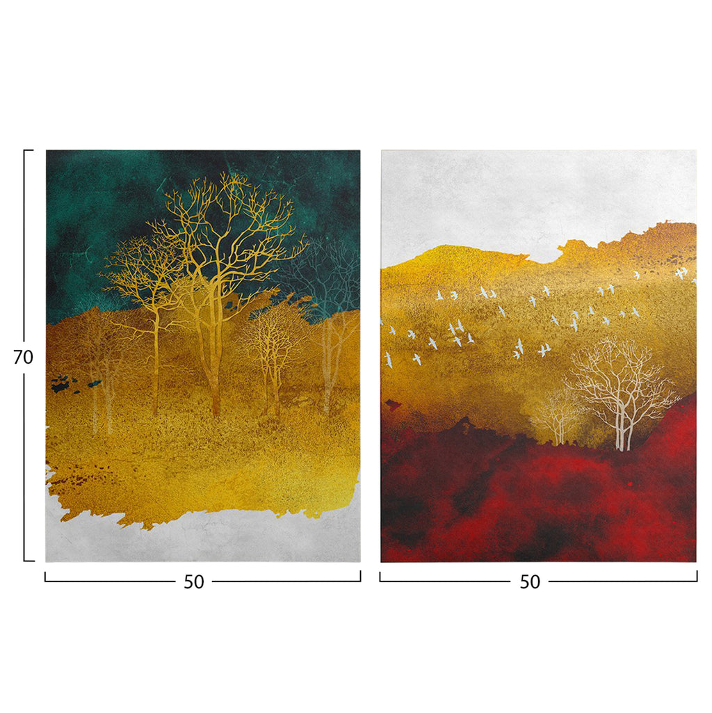 Стенописите трансформират начина, по който възприемаме пространството. И така, украсете вашето пространство с новата серия картини за стена GOBI! Тези цветни картини (2 бр.) изобразяват два различни селски пейзажа и са реализирани в щамповано платно върху дървена рамка и можете да ги поставите или заедно, или на различни места! РАЗМЕРИ: 50x3(дебелина)x70H см. (X2) ГРИЖА: Почистване на прах, когато е необходимо. Не използвайте вода или химически почистващи препарати. ** Цветопредаването на продукта може леко да се различава от неговото фотографско представяне на вашия екран.