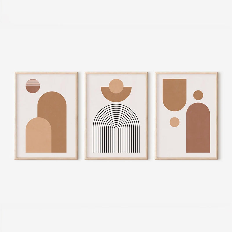 Подчертайте стената си с този впечатляващ комплект триптих панели Jackalon. Абстрактните, геометрични композиции на Jackalon, доминирани от топли земни тонове, следват естетиката Boho-Minimalism, придавайки на вашето пространство изискан и успокояващ стил.
