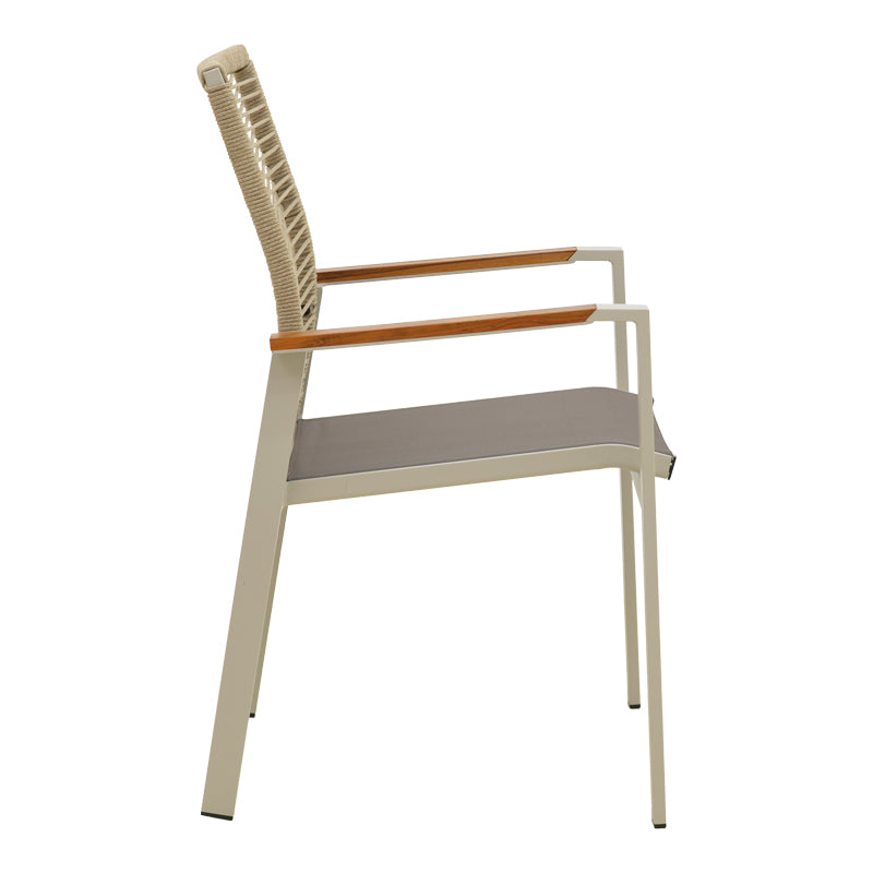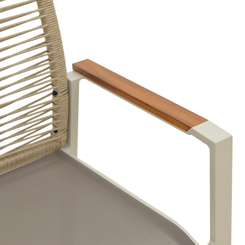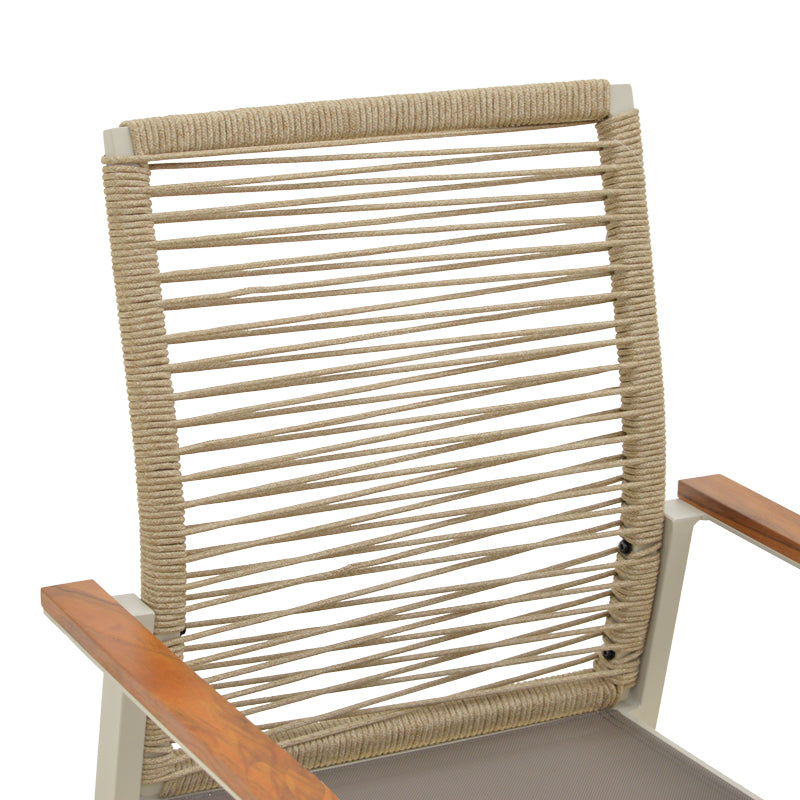 - Уникален дизайн с въже и тиково дърво: Ръчно изтъкан с издръжливо 5 мм въже за отличителна ефирна текстура. Подлакътниците от тиково дърво добавят луксозен, естествен щрих, който отличава този стол.