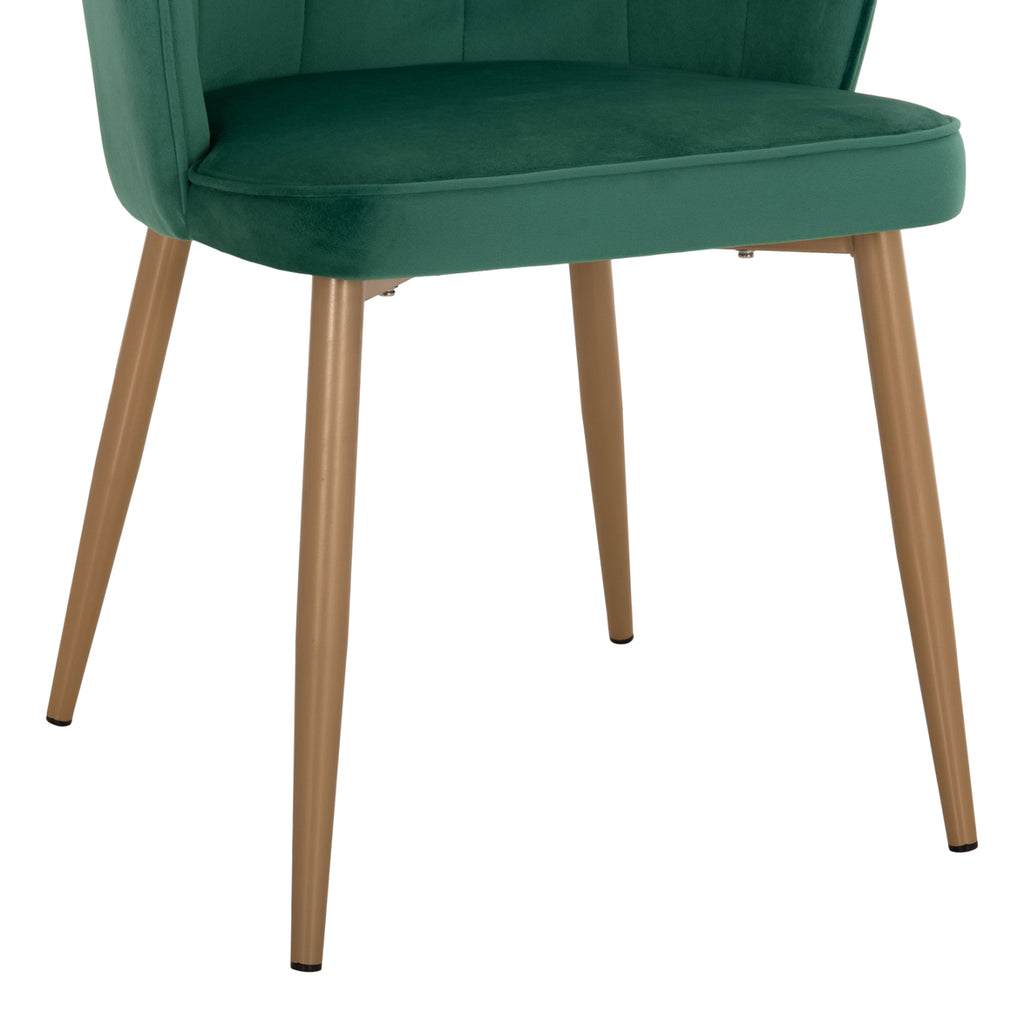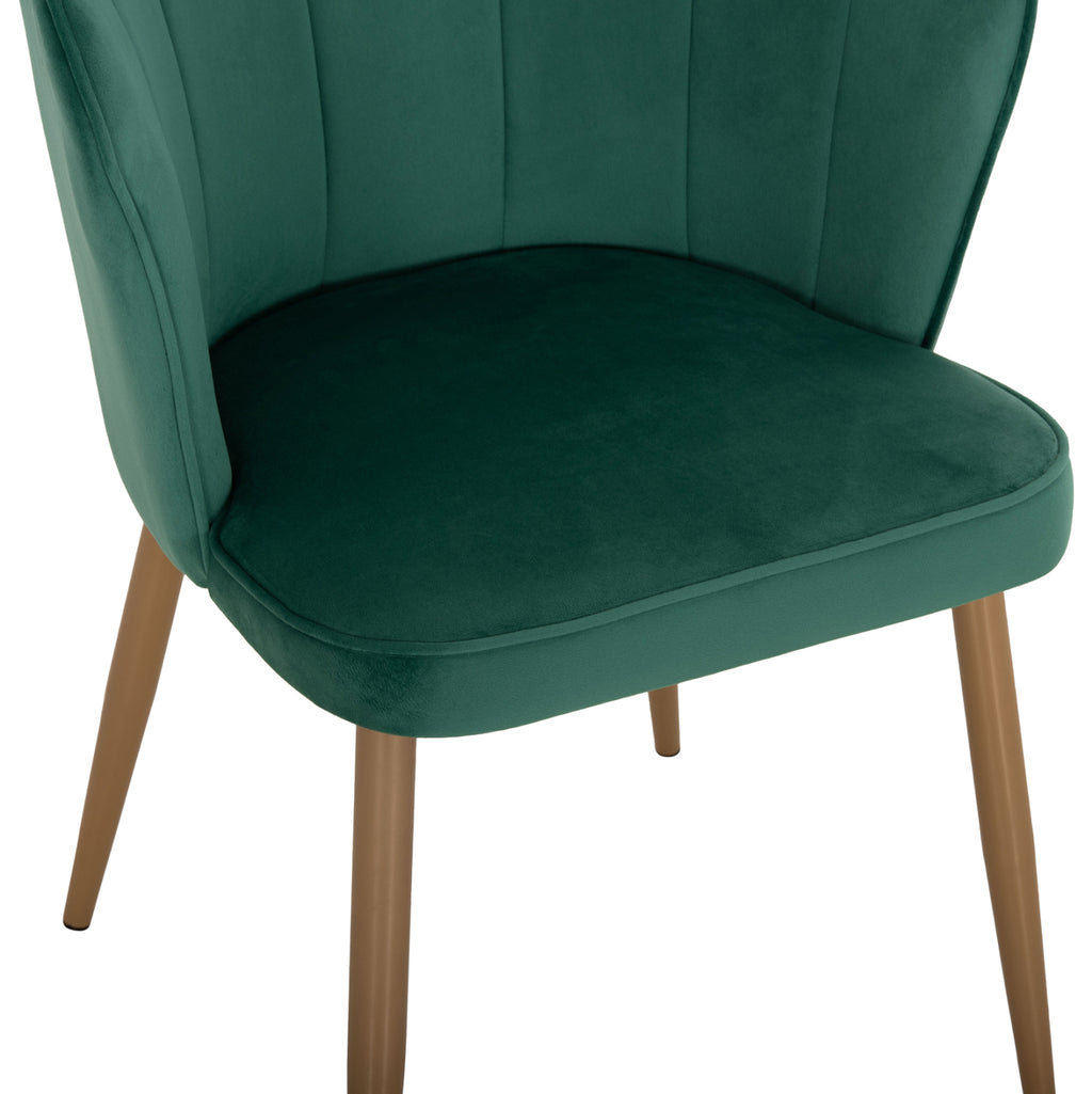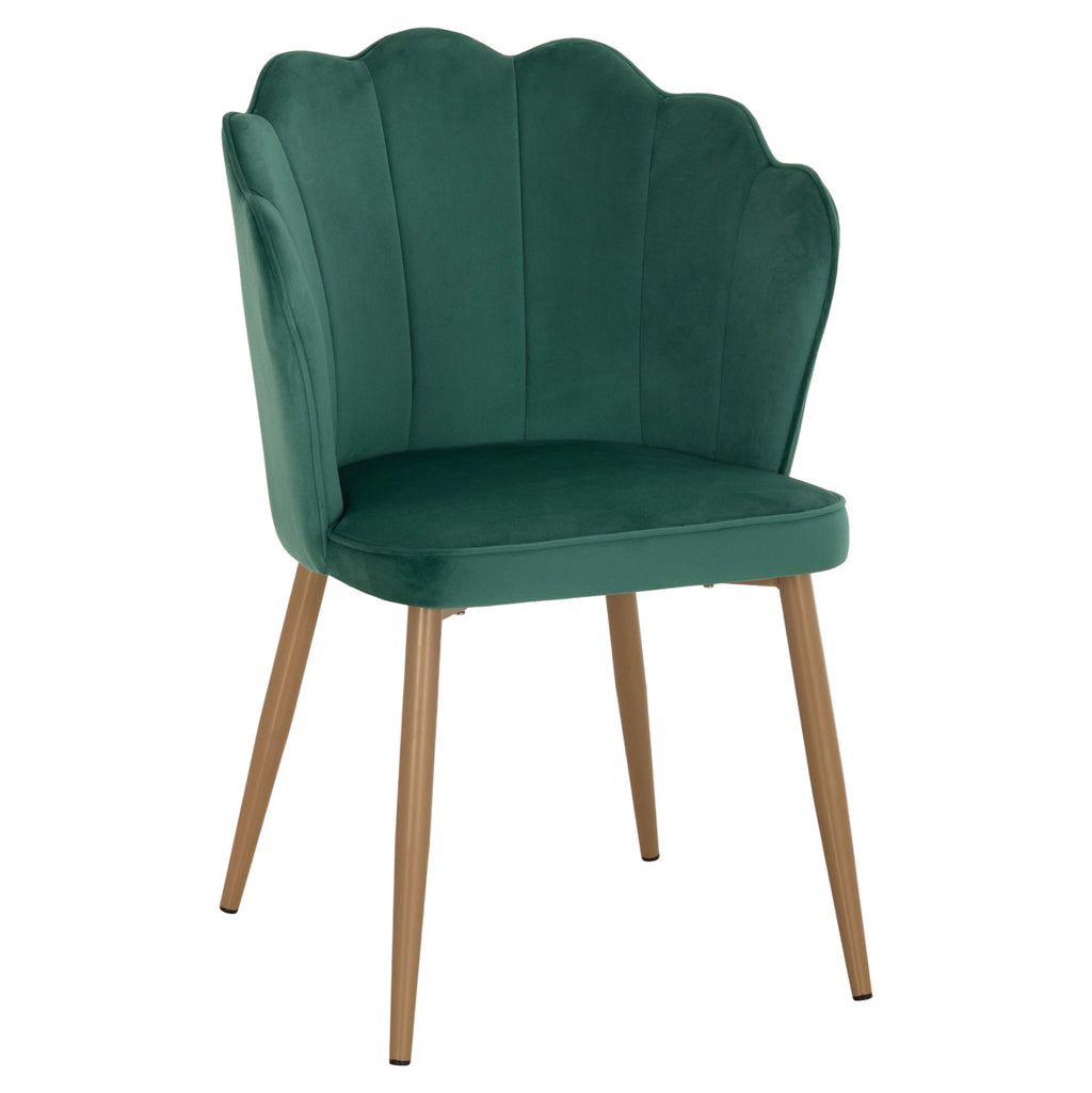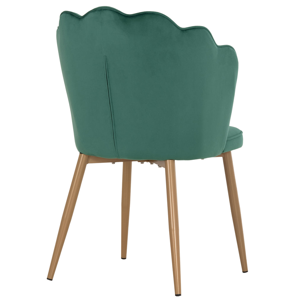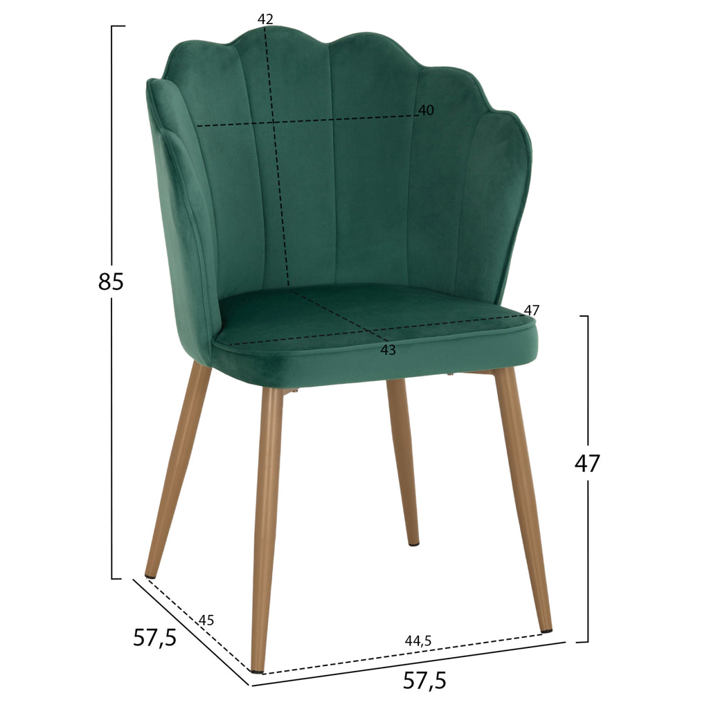Стол от кадифена дамаска в нюанс кипарис със златни крака 48х48х85см. Специалната форма, наподобяваща мида, ще ви накара да го обикнете, защото е оригинален, елегантен и ергономичен, като дизайнът и височината на гърба му поддържат и обгръщат кръста и гърба. Стол, проектиран с издръжливост и комфорт на седалката, за ежедневна употреба. Идеален за обновяване на интериорната декорация на вашия дом. Изработена от метална рамка, боядисана в златист цвят и подплатена с висококачествено кадифе, което осигурява издръжливост. Размери: 48х48х85см. Размери на седалката: 47х44 см. Размери на гърба: 45х42см. Височина на седалката: 49 см. Височина на крака: 42 см. Височина на ръцете: 85см. Разстояние между краката: 45х45 см. Продуктът се предлага разглобен във фабрична опаковка.