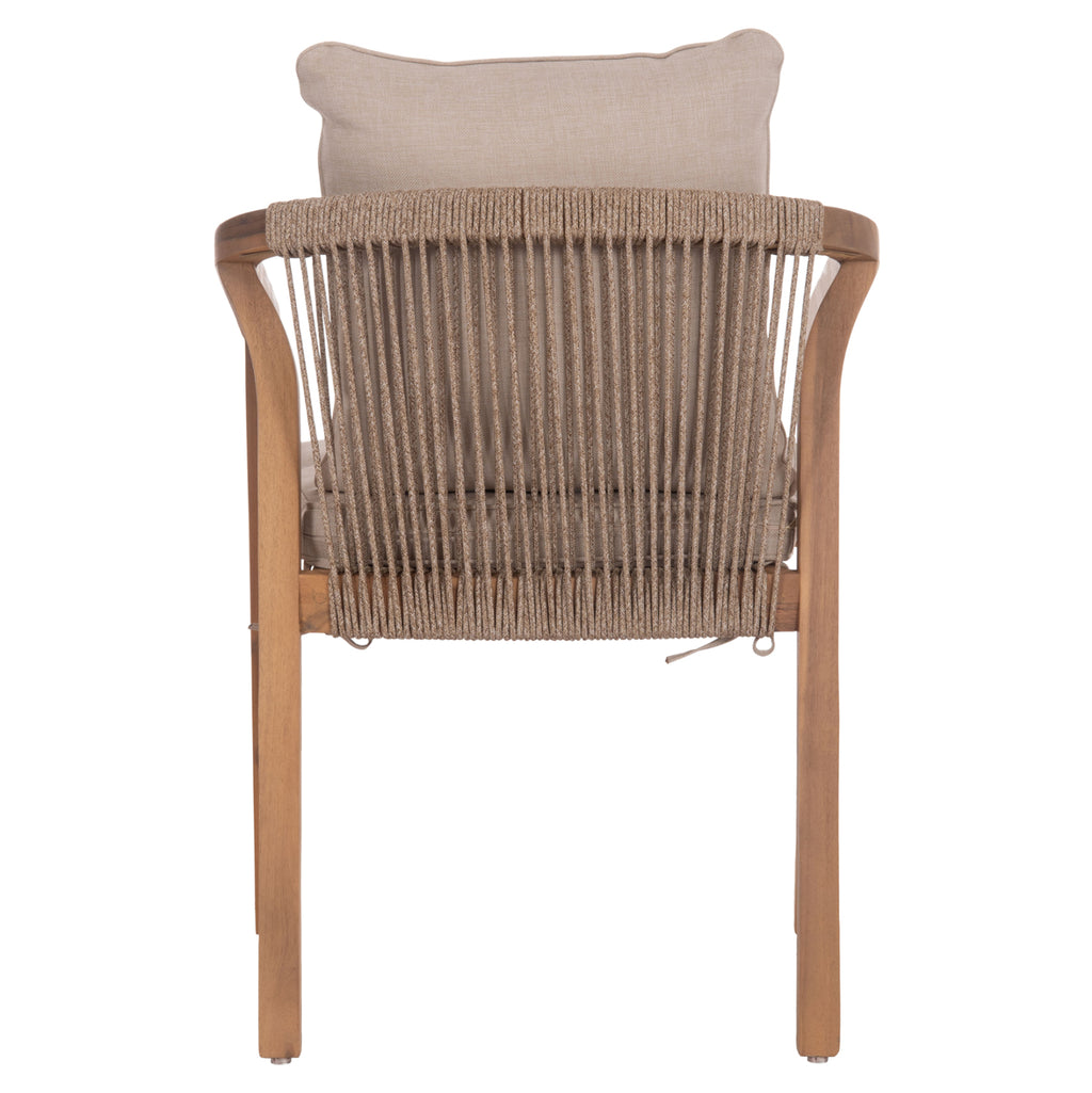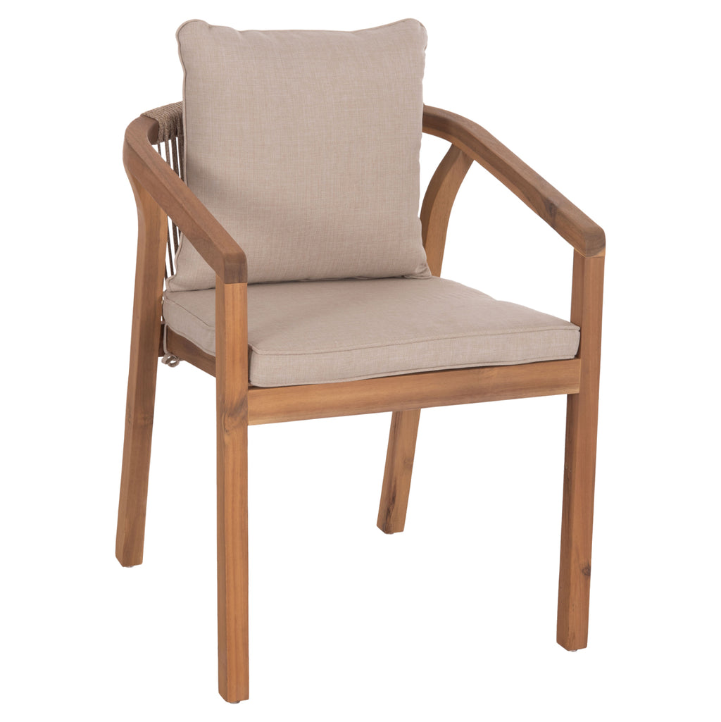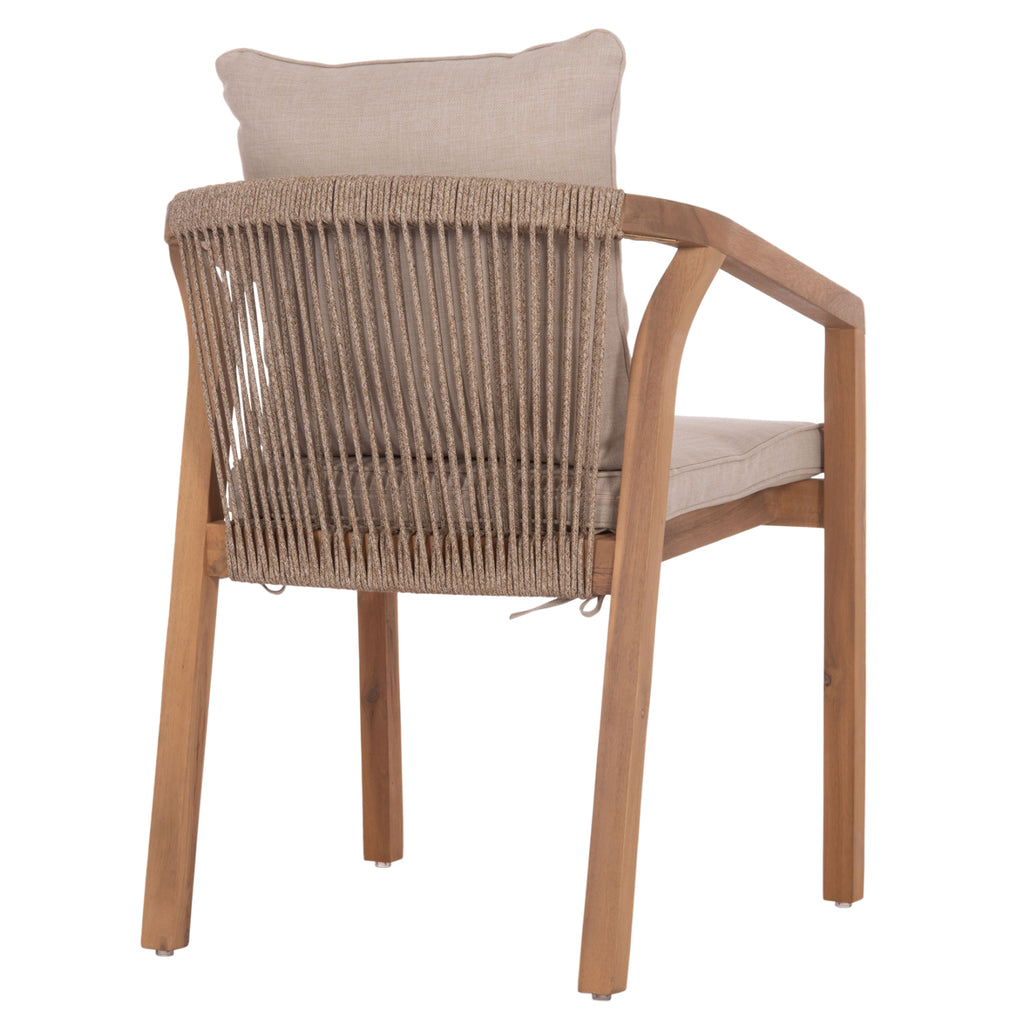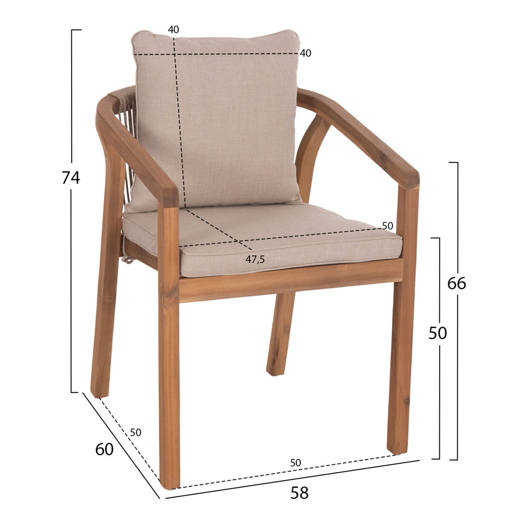 Градинският трапезен стол CONTREL е изработен от качествена акациева дървесина и въже в цвят БЕЖОВ. Седалката е от дърво, а облегалката е тапицирана с въже. Столът има възглавници в БЕЖОВ цвят както на седалката, така и на облегалката. РАЗМЕРИ: 61x58x75H см. Височина на седалката: 45 см. Плътност на пяната във възглавниците: D25 Дебелина на възглавницата на седалката: 5 см. Дебелина на възглавницата на облегалката: 10 см. МАТЕРИАЛИ ЗА ИЗРАБОТКА: -Рамката на стола е изработена от висококачествена акациева дървесина, която е един от най-добрите видове дървесина на пазара. Механичната ѝ здравина и механични свойства се доближават до тези на други добре познати дървесини, като бук, дъб, афзелия, тик и други. Тя е силно биологично устойчива, което означава, че проявява отлична устойчивост на действието на микроорганизми, които биха могли да разрушат материала и конструкциите. **Възможно е да има пукнатини, цветови вариации и разлики в размерите на продукта поради обработката на дървесината. Те не представляват дефект на продукта. -Калъфките за възглавници са изработени от 230 гр./м² полиестерна водоотблъскваща материя. ПОДДРЪЖКА: Като цяло, в случай на петна, тайната е бързото почистване с влажна кърпа, преди дървото да е имало време да се „намокри“, като същевременно калъфките за възглавници са свалени. * Цветопредаването на продукта може леко да се различава от фотографското му представяне на вашия екран.