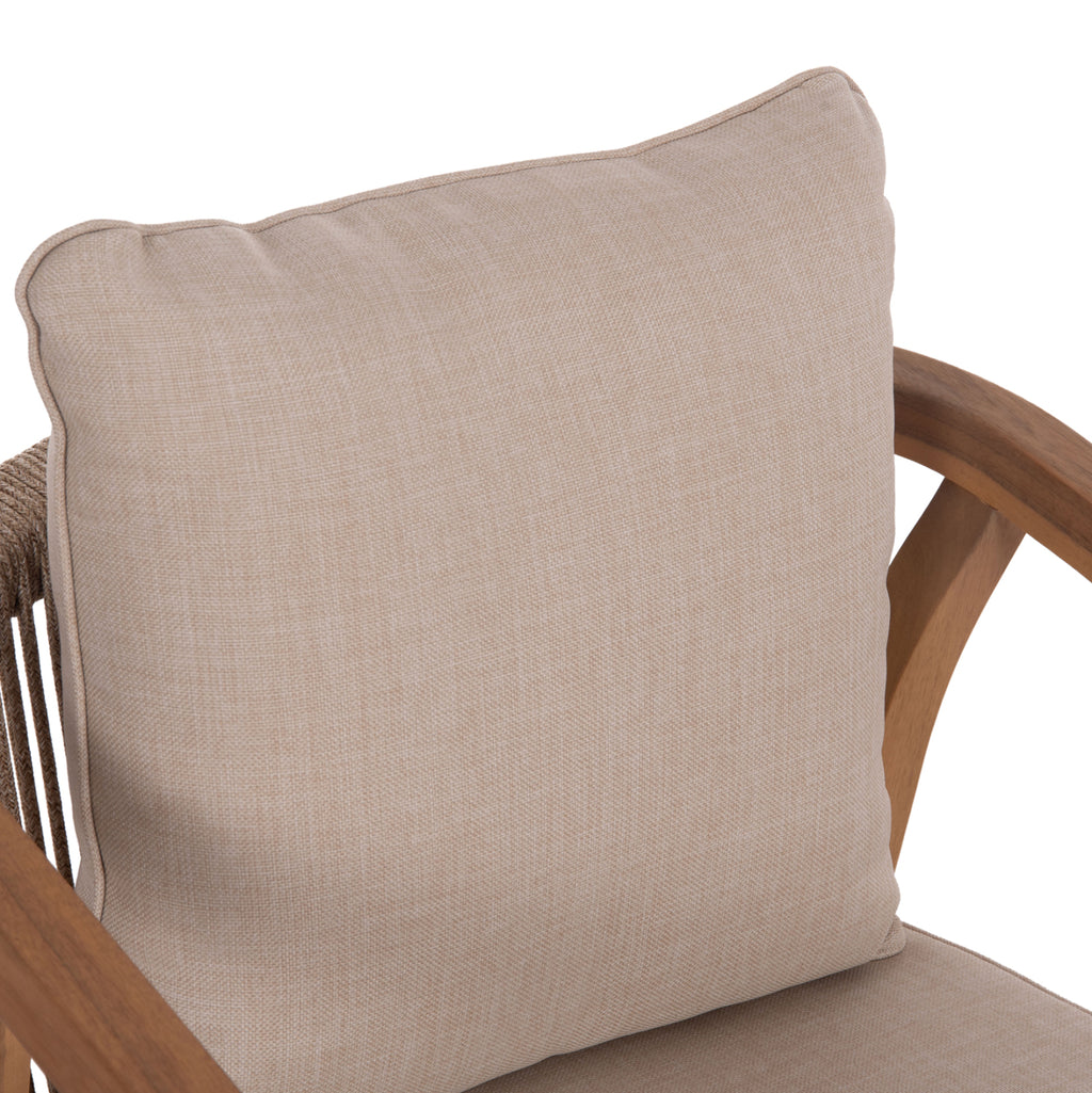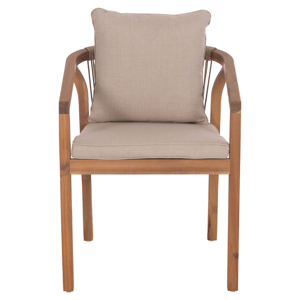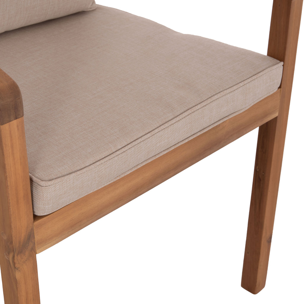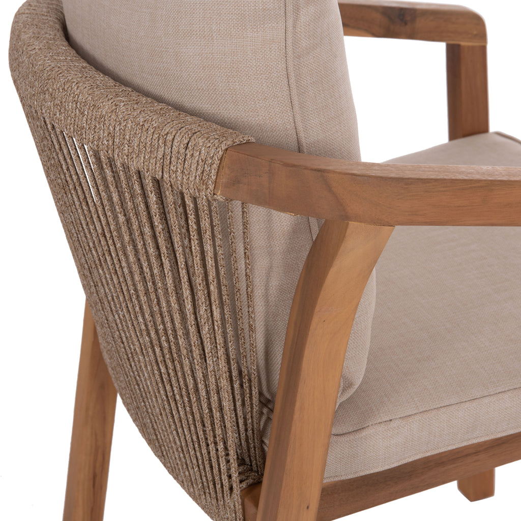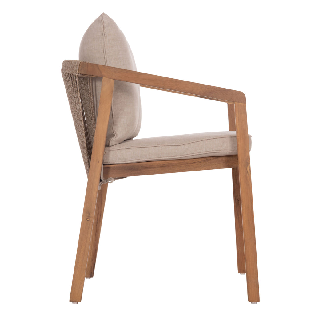 Градинският трапезен стол CONTREL е изработен от качествена акациева дървесина и въже в цвят БЕЖОВ. Седалката е от дърво, а облегалката е тапицирана с въже. Столът има възглавници в БЕЖОВ цвят както на седалката, така и на облегалката. РАЗМЕРИ: 61x58x75H см. Височина на седалката: 45 см. Плътност на пяната във възглавниците: D25 Дебелина на възглавницата на седалката: 5 см. Дебелина на възглавницата на облегалката: 10 см. МАТЕРИАЛИ ЗА ИЗРАБОТКА: -Рамката на стола е изработена от висококачествена акациева дървесина, която е един от най-добрите видове дървесина на пазара. Механичната ѝ здравина и механични свойства се доближават до тези на други добре познати дървесини, като бук, дъб, афзелия, тик и други. Тя е силно биологично устойчива, което означава, че проявява отлична устойчивост на действието на микроорганизми, които биха могли да разрушат материала и конструкциите. **Възможно е да има пукнатини, цветови вариации и разлики в размерите на продукта поради обработката на дървесината. Те не представляват дефект на продукта. -Калъфките за възглавници са изработени от 230 гр./м² полиестерна водоотблъскваща материя. ПОДДРЪЖКА: Като цяло, в случай на петна, тайната е бързото почистване с влажна кърпа, преди дървото да е имало време да се „намокри“, като същевременно калъфките за възглавници са свалени. * Цветопредаването на продукта може леко да се различава от фотографското му представяне на вашия екран.
