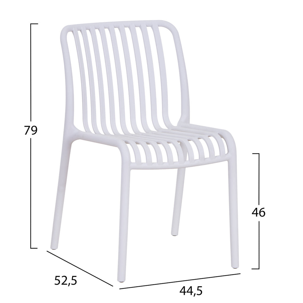Столът CONVEE е класически стол за открито, който ще задоволи всяка ваша нужда във вашия двор или балкон. Той е висококачествен и елегантен на външен вид, а извитата седалка отпред го прави много удобен и определено хваща окото. Целият стол е изработен от полипропиленови греди в БЯЛ цвят. Той е стифиращ, лек и удобен, идеален избор за професионална употреба, като например в кетъринг и др. ТЕХНИЧЕСКИ ХАРАКТЕРИСТИКИ: Размери: 48x56x79H cm. Размери на седалката: 42х42 см. Размери на гърба: 46х38см. Височина на седалката: 45 см. Разстояние между краката: 45,5х51,5 см. МАТЕРИАЛИ НА КОНСТРУКЦИЯТА: Целият стол е изработен от подсилен полипропилен. Полипропиленът е особено устойчив на тегло и вода, като същевременно има голяма устойчивост на температури до 125 градуса по Целзий. Освен това неговата издръжливост не се ограничава до тегло, вода и температура, но е необичайно устойчив на много химически разтворители, киселини и основи. ПОДДРЪЖКА: Мебелите от полипропилен се почистват лесно с влажна кърпа. Ако са на открито, могат да се почистват директно с течаща вода. ** Цветопредаването на продукта може леко да се различава от неговото фотографско представяне на вашия екран.