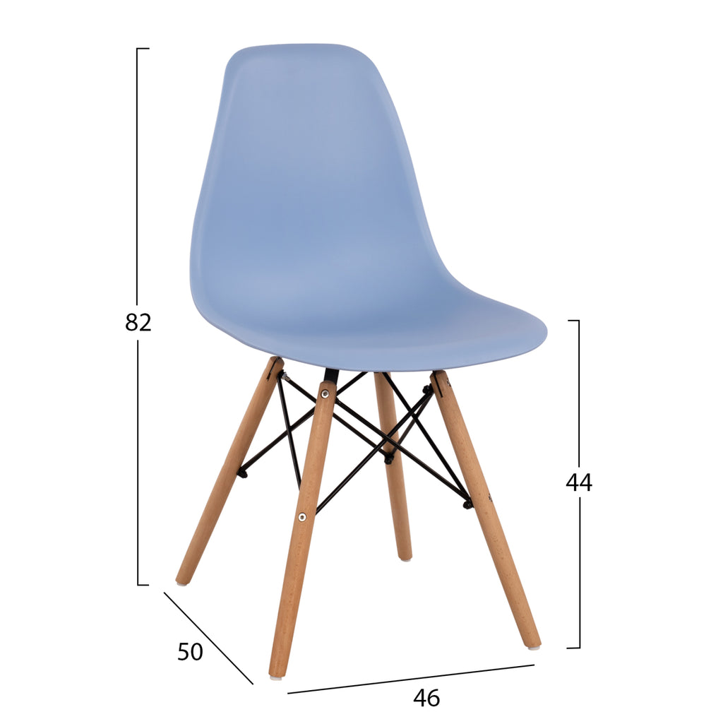 Столът Иви има семпъл и модерен дизайн без подлакътници, а седалката със средно висока облегалка е от формовано парче полипропилен в СИН цвят. Столът се поддържа от 4 крака с наклон навън за горна твърдост, които са "вързани" един за друг и за седалката с метални греди.