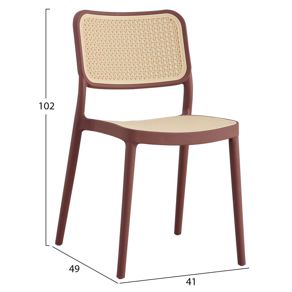 Столът MEKO притежава всичко, което бихте искали от подобна мебел. Той е с високо качество и елегантен външен вид и със сигурност ще привлече окото. Целият стол е изработен от едно парче полипропилен в цвят TILE с леко извита облегалка в БЕЖОВ цвят, който е в стил полипропилен мат. Седалката е в БЕЖОВ ЦВЯТ и също е в стил полипропиленова подложка. Столът е стифиращ, лек и удобен и ще се превърне в любимо място за сядане във всяко пространство, благодарение на своята практичност. Идеален избор и за професионална употреба, като кетъринг и др. ТЕХНИЧЕСКИ ХАРАКТЕРИСТИКИ: Размери: 41x49x102H cm. МАТЕРИАЛИ НА КОНСТРУКЦИЯТА: Целият стол е изработен от подсилен полипропилен. Полипропиленът е особено устойчив на тегло и вода, като същевременно има голяма устойчивост на температури до 125 градуса по Целзий. Освен това неговата издръжливост не се ограничава до тегло, вода и температура, но е необичайно устойчив на много химически разтворители, киселини и основи. ПОДДРЪЖКА: Мебелите от полипропилен се почистват лесно с влажна кърпа. Ако са на открито, могат да се почистват директно с течаща вода.