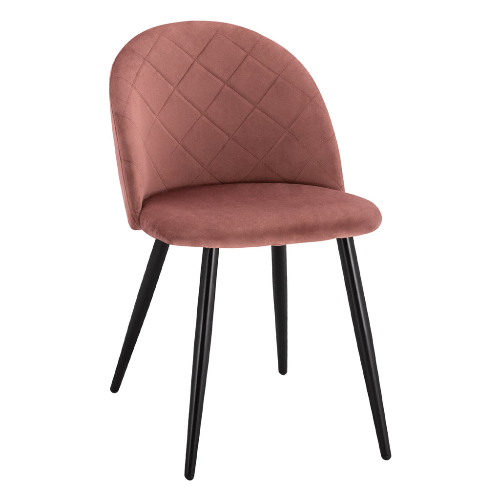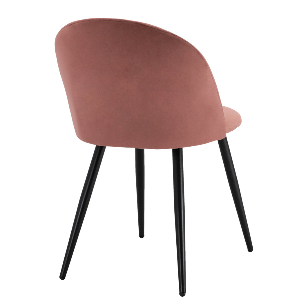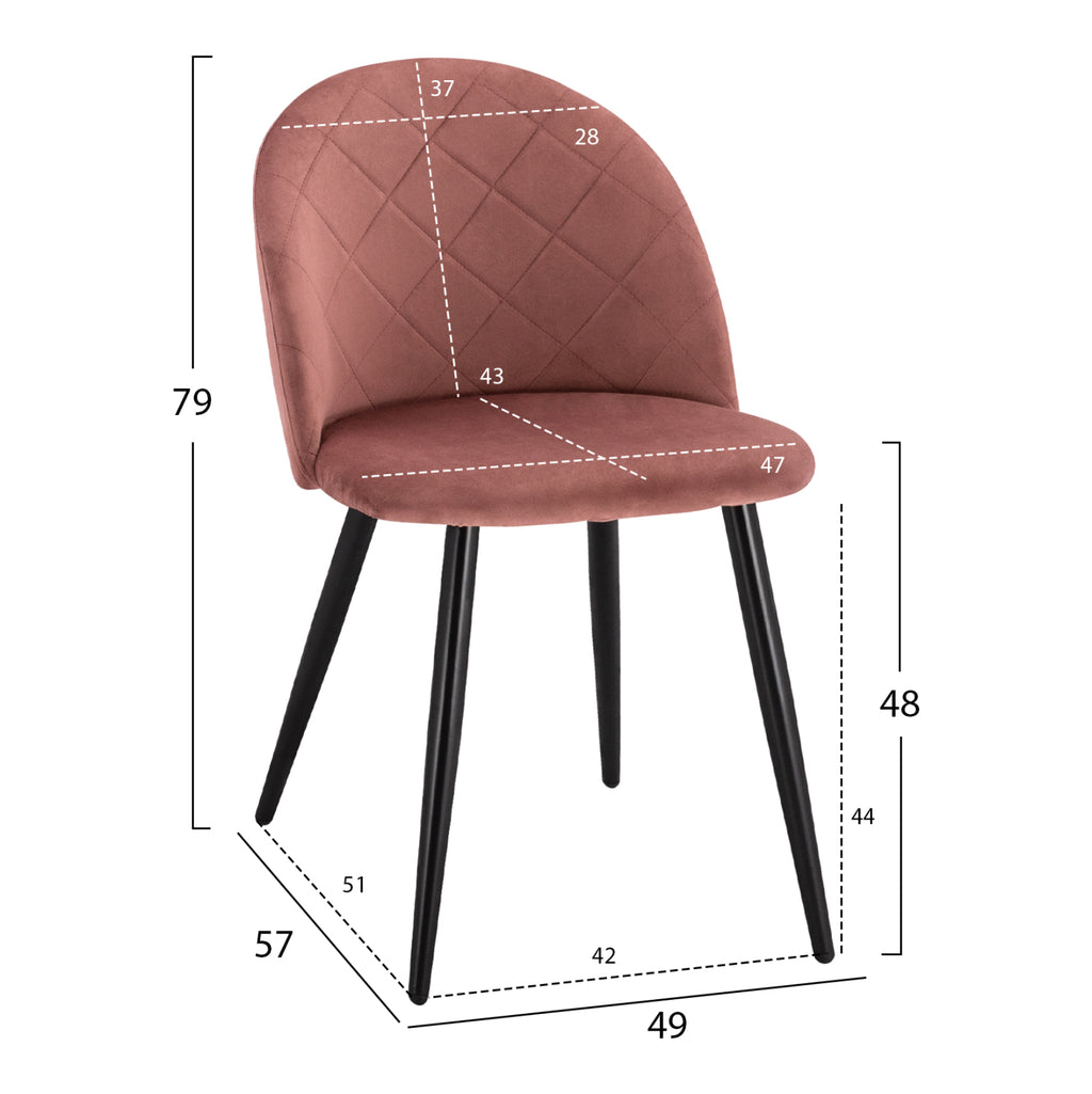 Стол MELANIE в нежен розов нюанс (гнила ябълка) е тапициран с луксозна кадифена дамаска и има черна метална конструкция. Това е стол със специална естетика и дизайн, който става част от декорацията на вашия дом.