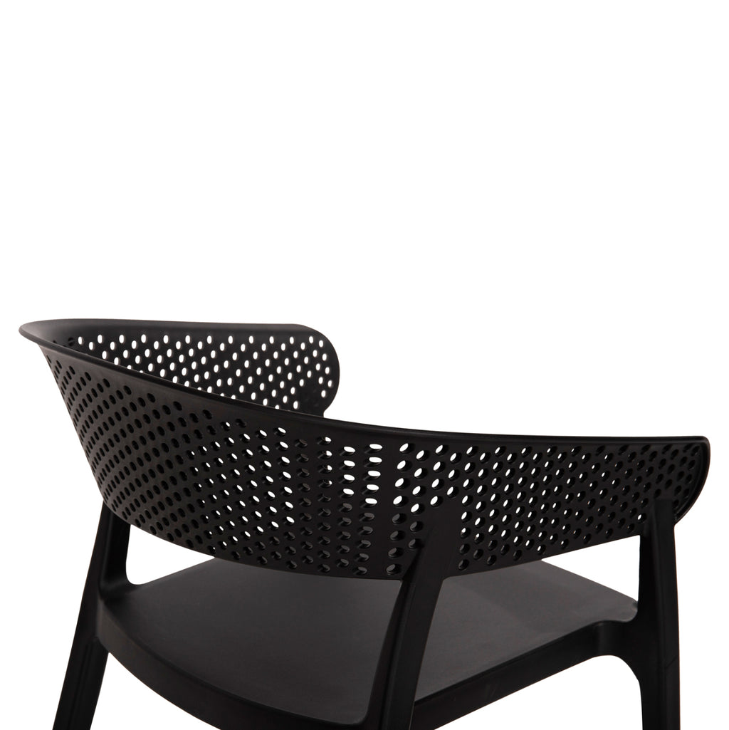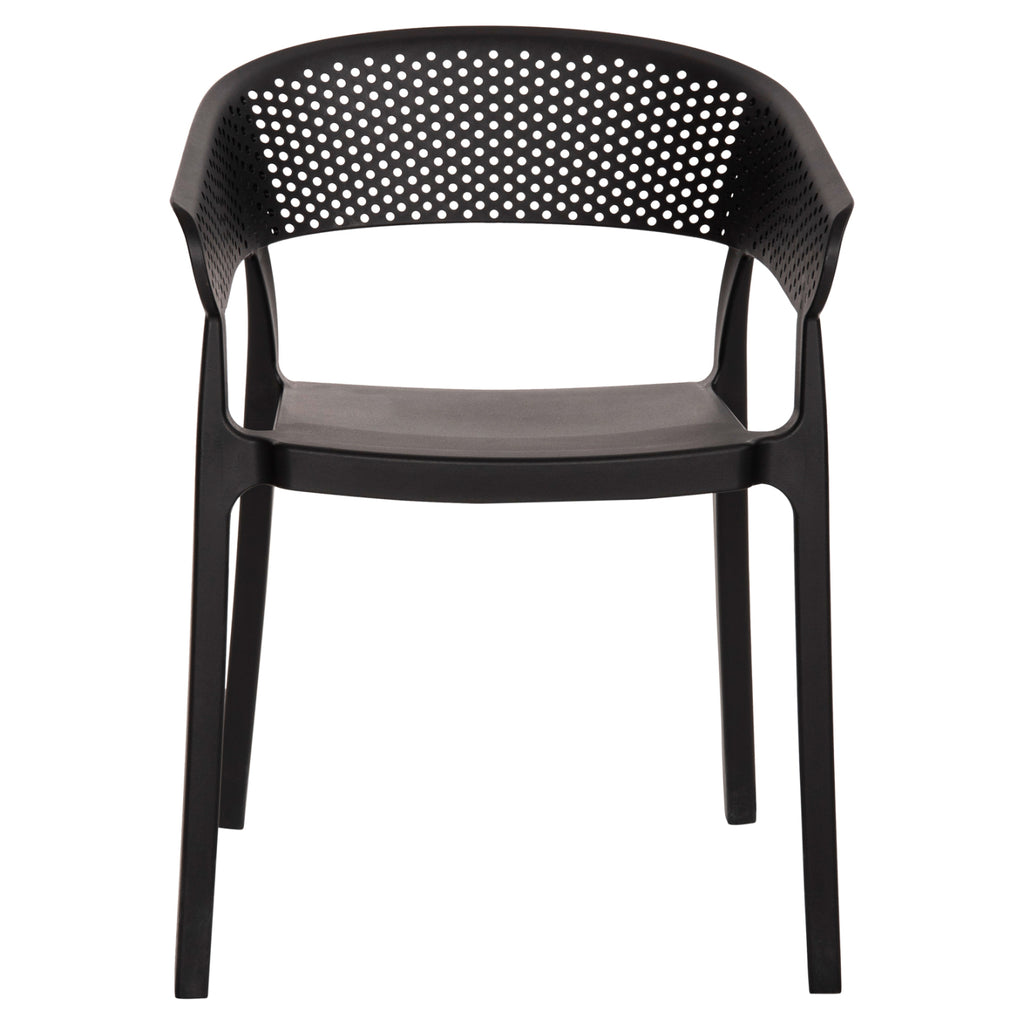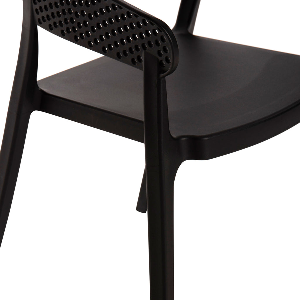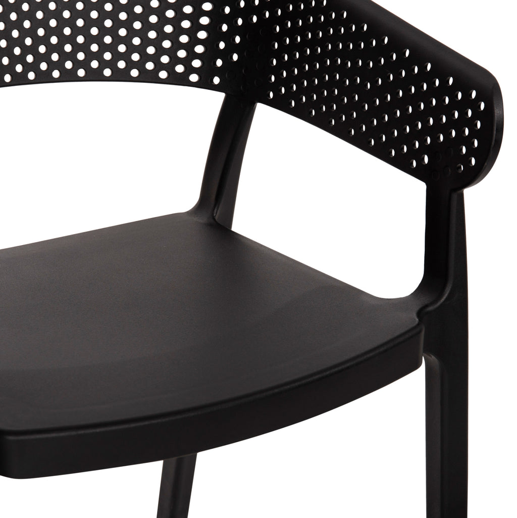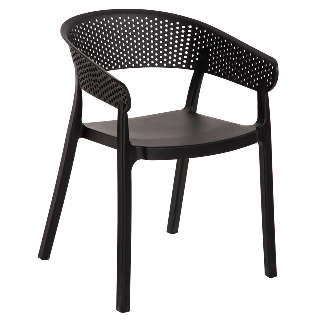 Полипропиленово кресло в ЧЕРЕН цвят. Идеално предложение за използване във външни пространства, независимо дали професионални (банкетни зали, кетъринг компании и др.) или за дома. Фотьойлът се състои от гладка седалка и полукръгла, независима и "перфорирана" облегалка и подлакътници. Той е красив и ще обнови естетически всяко външно пространство. ТЕХНИЧЕСКА ХАРАКТЕРИСТИКА: Общи размери: 53.5x50.5x73H cm. Височина на седалката: 45 см. МАТЕРИАЛ НА ИЗРАБОТКА: Столът е изработен от 100% висококачествен полипропилен. Полипропиленът е особено устойчив на тегло и вода, като същевременно има голяма устойчивост на температури до 125 градуса по Целзий. Освен това неговата издръжливост не се ограничава до тегло, вода и температура, но е необичайно устойчив на много химически разтворители, киселини и основи. ПОДДРЪЖКА: Полипропиленовите столове се почистват лесно с влажна кърпа. Ако са на открито, могат да се почистват директно с течаща вода. ПРЕДИМСТВА: Полипропиленовият стол има само предимства и е чудесен избор за външни бизнес пространства. По-специално, неговият сравнително удобен размер, както и неговата издръжливост, го правят най-добрият избор за банкетни зали или за кетъринг фирми, или за всяко открито пространство, благодарение на изключителната му лекота за подреждане на големи количества. Но най-важното нещо за полипропилена е, че той е екологичен, защото може да се рециклира.