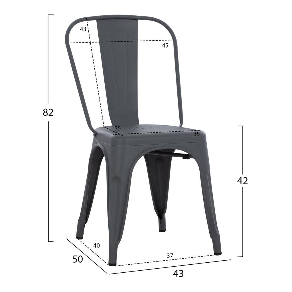 MELITA-PRO метален трапезарен стол в СИВ нюанс. В модерен и семпъл ИНДУСТРИАЛЕН дизайн, който е най-новата пазарна тенденция. *Подходящ за професионална употреба със специална издръжливост. ** РАЗМЕРИ ЗА ПОДРЕЖДАНЕ: 44x47x84.5H cm. Размери на седалката: 35х35 см. Размер на гърба: 45x43H см. Височина на седалката: 44 см. ПОДДРЪЖКА: За почистване на стола е достатъчно просто избърсване с влажна кърпа. Не използвайте химически почистващи препарати, а само меки почистващи препарати за упорити петна. ** Цветопредаването на продукта може леко да се различава от неговото фотографско представяне на вашия екран.