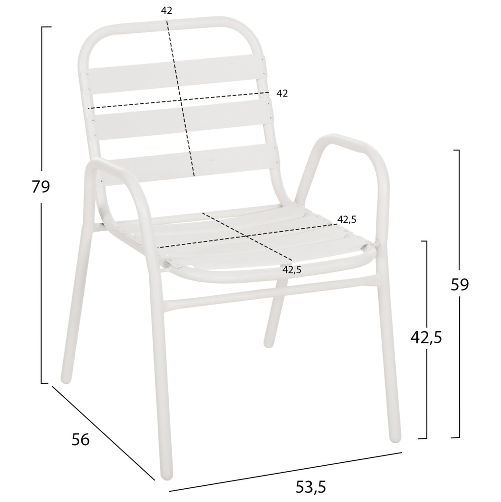 Външен стол PRELUDE е изработен от метал и алуминий в БЯЛ цвят. Рамката му е метална, а облегалката и седалката са изработени от алуминиеви "филии". От гледна точка на дизайна, той е семпъл с красиви извивки и ниски рамена, а фактът, че е лек и МОЖЕ ДА СЕ НАБИРА, го прави особено практичен, тъй като можете лесно да го съхранявате на възможно най-малко място. РАЗМЕРИ: 54x56x79H см. Размери на седалката: 42,5х42 см. Размери на гърба: 42.5х41.5см. Височина на ръцете: 58,5 см. Височина на седалката: 41,5 см. Височина на крака: 39 см. Разстояние между краката: 44,5-49х51-55,5 см. Разстояние задни крака: 45.5-50.5 см. Размери на метала: Φ24x0.8mm КОНСТРУКТИВНИ МАТЕРИАЛИ: Алуминият е "зелен" и антикорозионен материал, който може да се рециклира неограничено време, като запазва характеристиките си без влошаване на качеството. Информация: Електростатичното боядисване е процес на сухо покритие, използван като метално покритие. Електростатичното боядисване е нанасяне на сух прах чрез електростатичен процес, който след това се „свързва“ към метала чрез топлина. ПОДДРЪЖКА: Благодарение на издръжливостта на строителните материали, поддръжката на фотьойла е лесна. Освен редовното почистване от прах, можете да го избършете с влажна кърпа. ** Цветопредаването на продукта може леко да се различава от неговото фотографско представяне на вашия екран.
