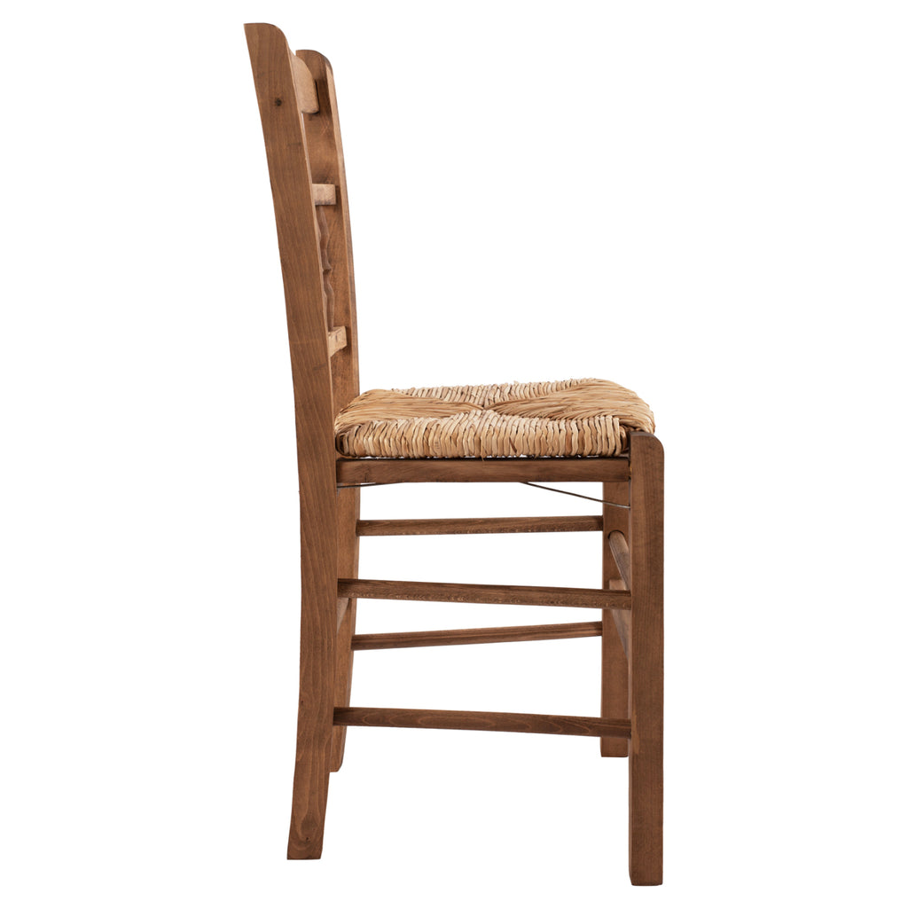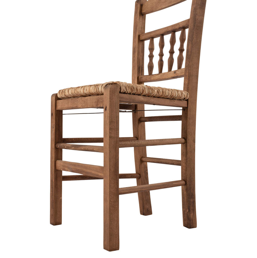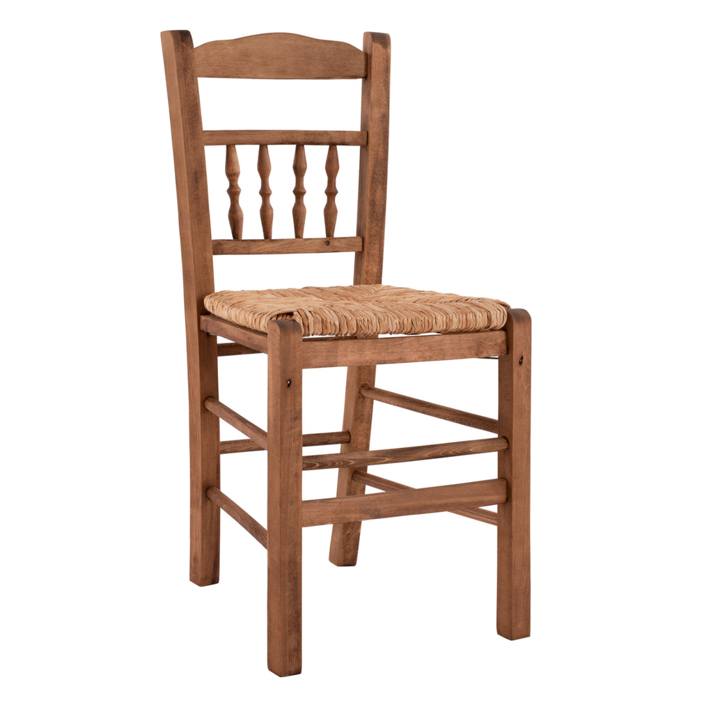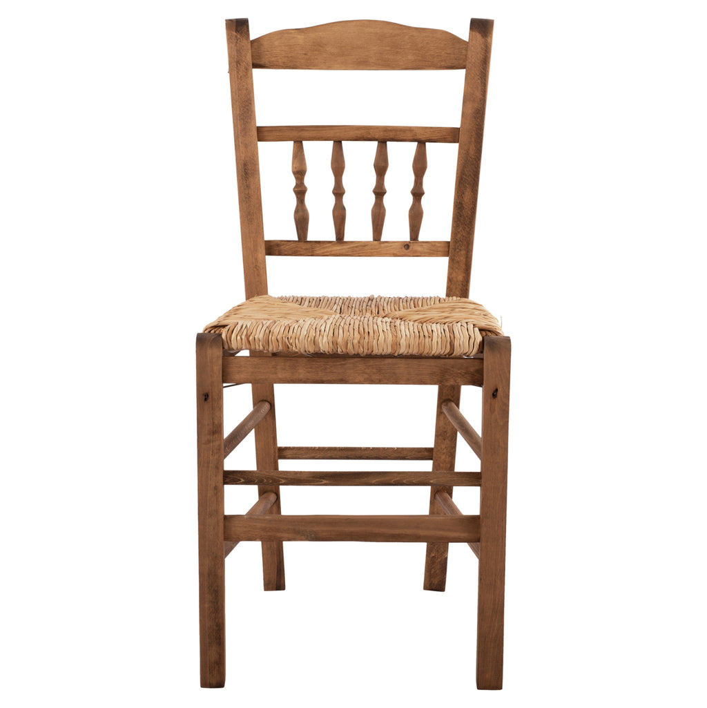 Изработен от 100% масивна букова дървесина, столът впечатлява с изключителна здравина и дълготрайност. Повърхността е импрегнирана в стилен цвят орех, който подчертава натуралната текстура на дървото. Седалката е изработена от естествен ратан, който предлага комфорт, проветривост и устойчивост при ежедневна употреба.