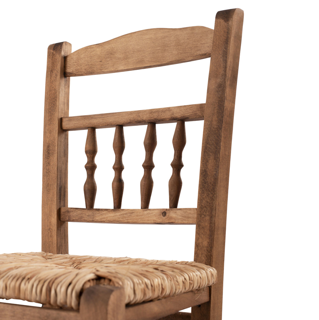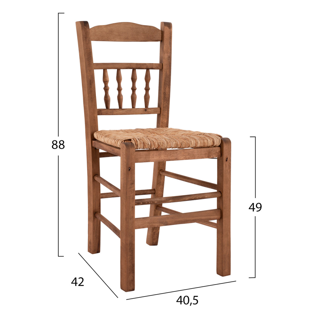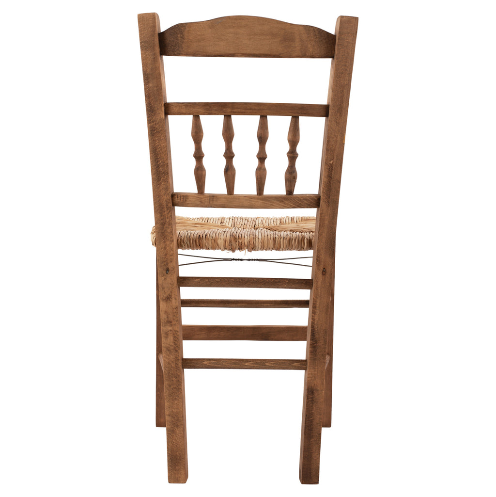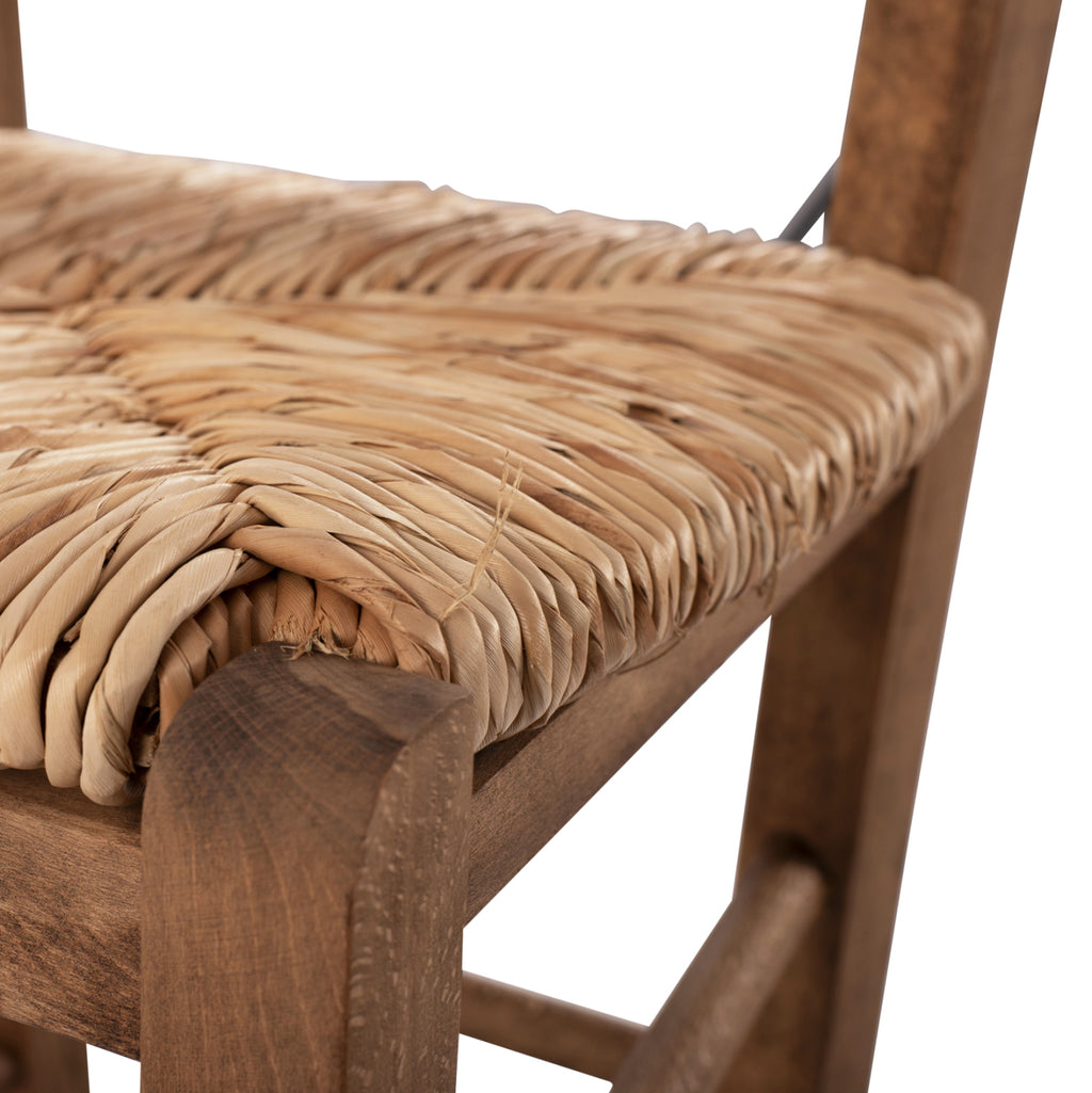 Изработен от 100% масивна букова дървесина, столът впечатлява с изключителна здравина и дълготрайност. Повърхността е импрегнирана в стилен цвят орех, който подчертава натуралната текстура на дървото. Седалката е изработена от естествен ратан, който предлага комфорт, проветривост и устойчивост при ежедневна употреба.