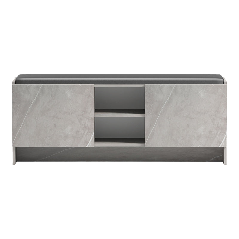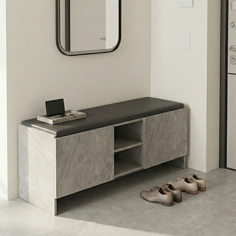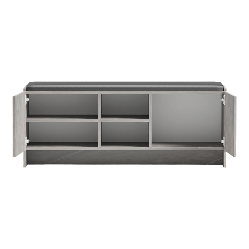 - Съхранение: Разполага с два шкафа с врати на панти за дискретно съхранение на обувки или други предмети, плюс централно отворено пространство с рафт - идеален за ежедневни обувки или малки кошници за съхранение на аксесоари.