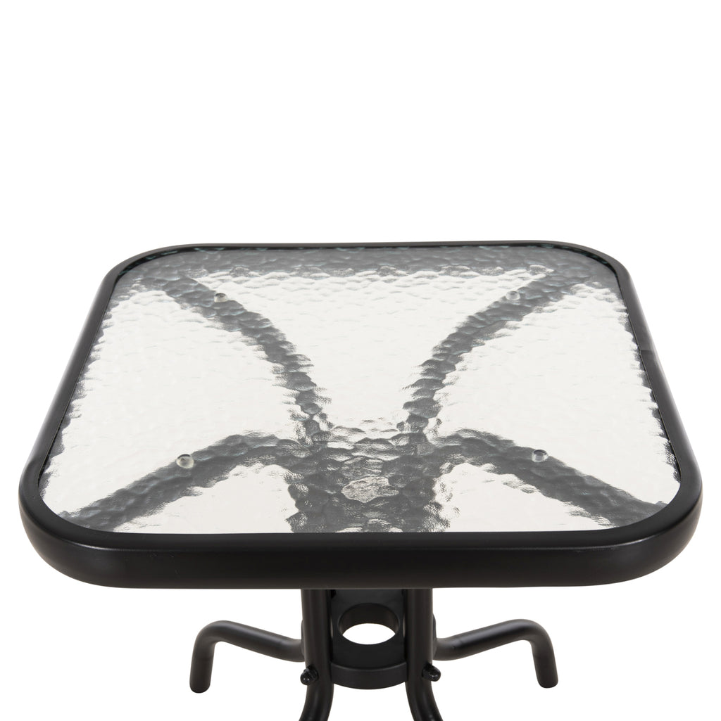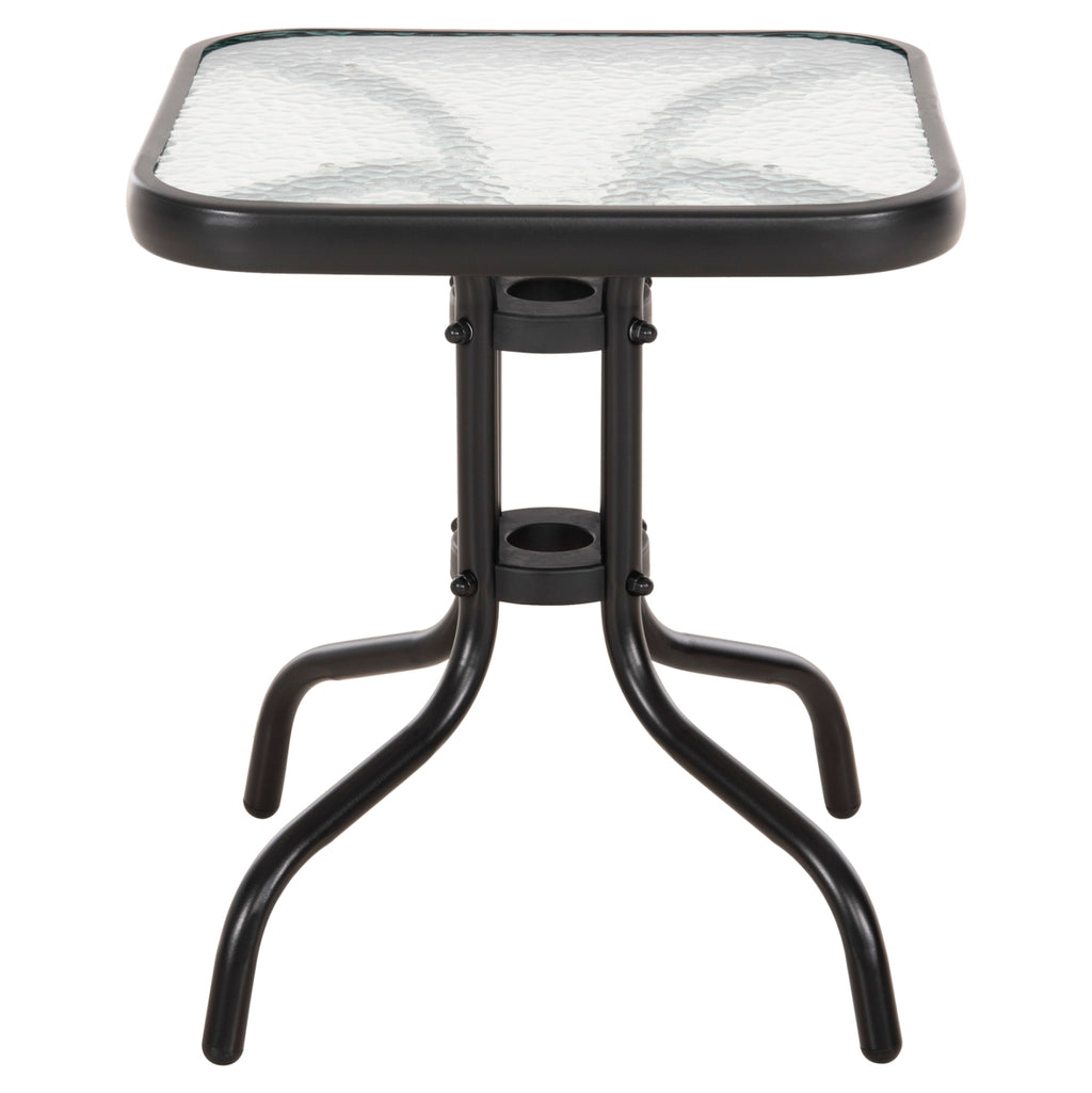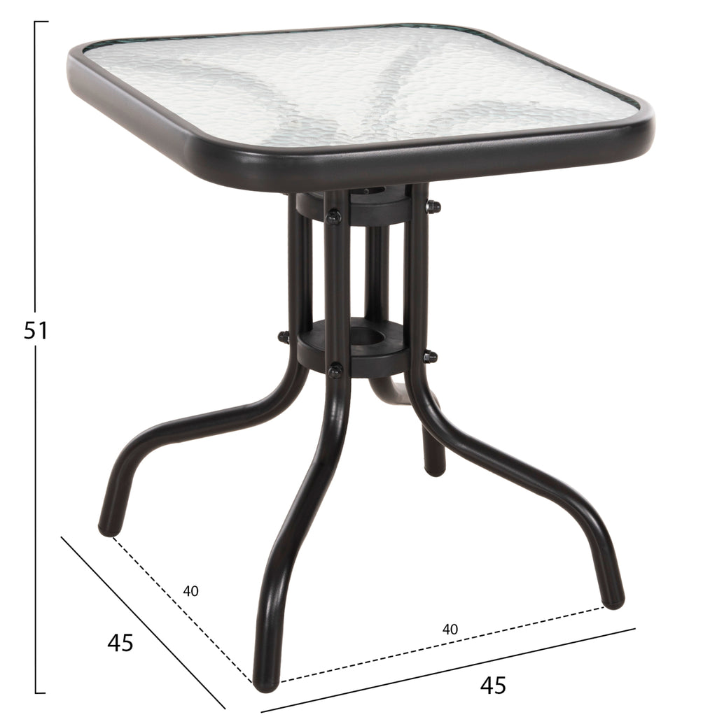 Външната помощна маса FIGO в ЧЕРНО е къса, квадратна със заоблени ъгли и извити крака. Това е много популярен модел, който липсва на почти всеки балкон или градина. Холната маса е подходяща и за ограничени пространства, като тераси или малки дворове. РАЗМЕРИ: 45x45x51Y см. Разстояние между краката: 40х40 см. Метална рамка: Φ24x0.8mm дебелина МАТЕРИАЛИ НА ИЗРАБОТКА: Рамката е метална с електростатично боядисване. Електростатичното боядисване е процес на сухо покритие, използван като метално покритие. Електростатичното боядисване е нанасяне на сух прах чрез електростатичен процес, който след това се „свързва“ към метала чрез топлина. Плотът е изработен от нечупливо стъкло или безопасно стъкло. Закаленото или "нечупливо" стъкло е вид безопасно стъкло около четири пъти по-здраво от обикновеното стъкло. И за разлика от обикновеното стъкло, което може да се пръсне на назъбени парчета, когато се счупи, закаленото стъкло се разбива на малки, относително безобидни гранулирани парчета. В резултат на това закаленото стъкло се използва в среди, където човешката безопасност е приоритет, като например жилищни приложения и др. ПОДДРЪЖКА: От горното може да се види, че комплектът не се нуждае от специална поддръжка. Достатъчно е минаване с влажна кърпа или дори със специални почистващи препарати. ПРЕДИМСТВА: • Класически и вечен дизайн • Лесна поддръжка • Качествени строителни материали • Невероятно съотношение цена-качество. Масата се доставя в несглобен вид и се сглобява лесно, тъй като всички необходими елементи са включени в пакета. **Точното цветопредаване на продукта може леко да се различава от действителния продукт поради различни настройки на монитора.