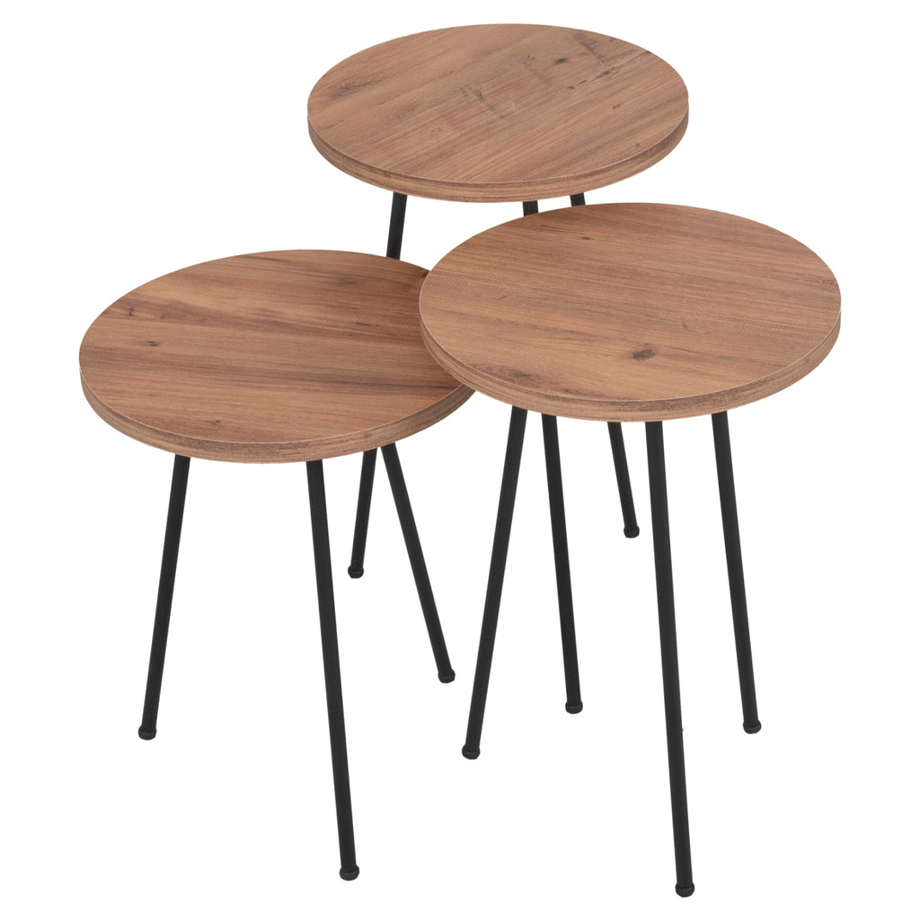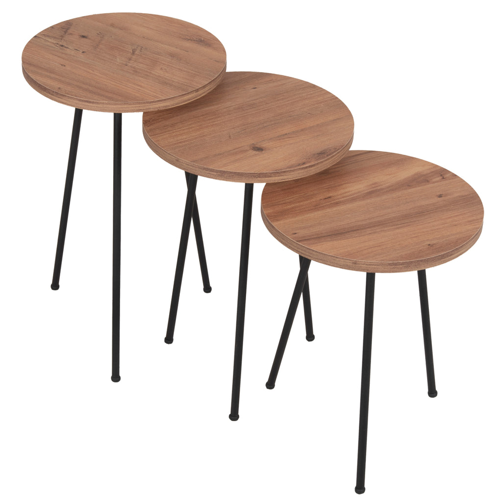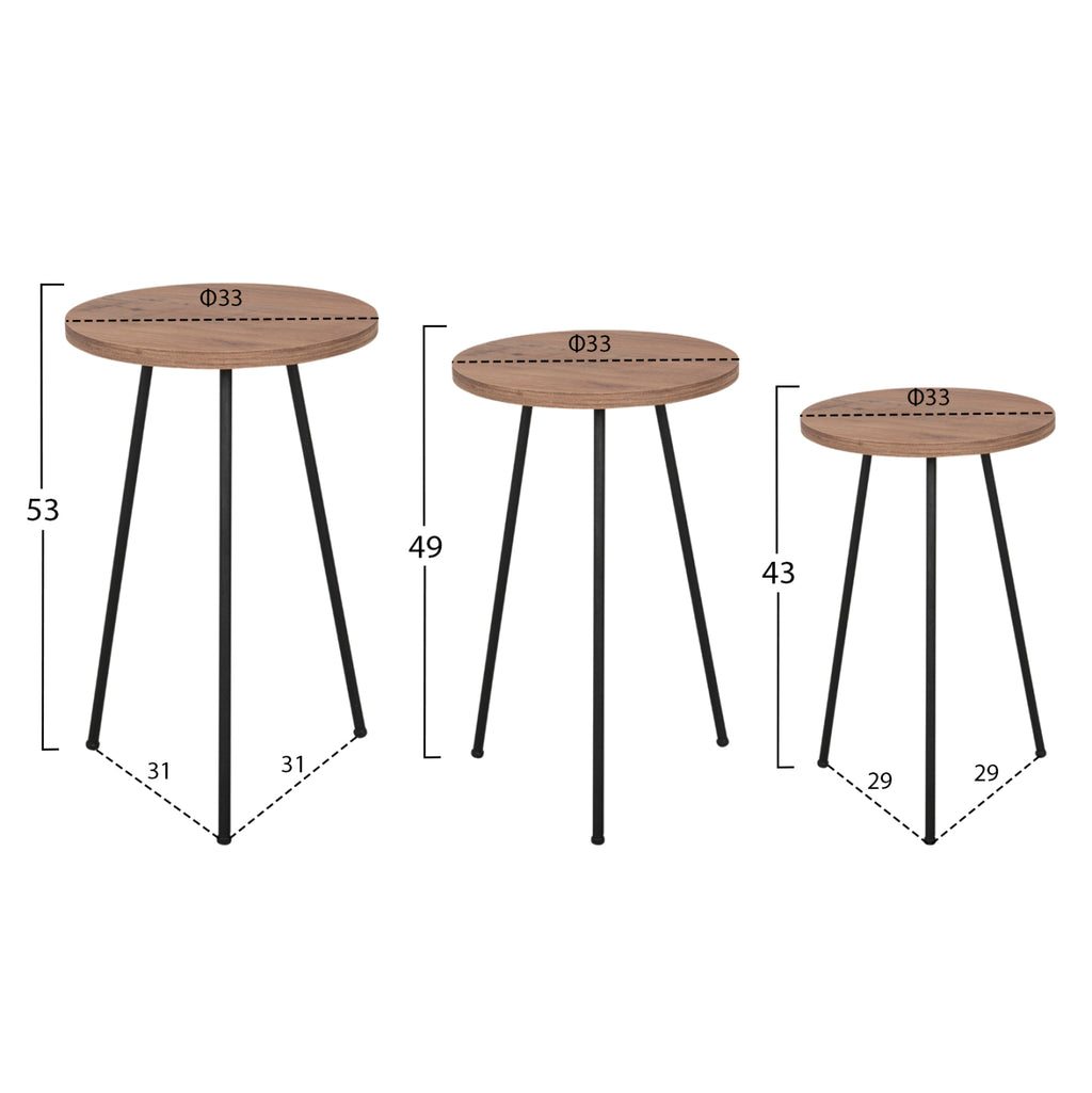 3-те странични маси KISSA дойдоха да откраднат шоуто със своя стил и практичност. Повърхността им е изработена от меламин 18 мм в НАТУРАЛЕН дървесен цвят, а краката им са масивни метални в ЧЕРЕН цвят. Тяхната характеристика е, че се предлагат в 3 различни височини, обслужващи всяка нужда в хола. РАЗМЕРИ: Ниска: Φ33x43H. Среден: Φ33x49Hq. Височина: Φ33x53см. ПОДДРЪЖКА: Както повърхността, така и краката се почистват лесно с влажна кърпа. КАКВО ХАРЕСВАМЕ: •Здрава конструкция •Естетически красиви маси •Практични за използване *Продуктът се доставя във фабрична опаковка ** Цветопредаването на продукта може леко да се различава от фотографското изображение на вашия екран.