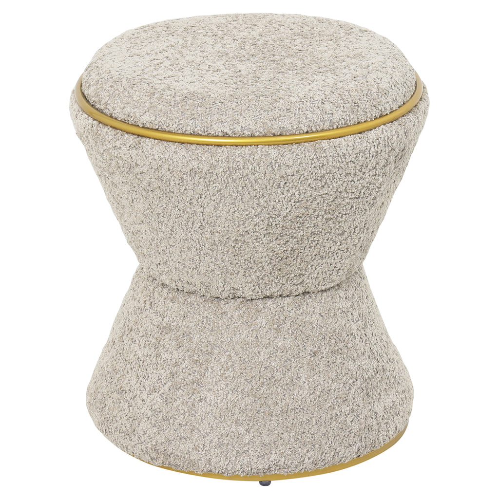 Цилиндрична табуретка LINNER, тапицирана с топъл плат от букле в БЕЖО и ЗЛАТЕН метален детайл ("пръстен") на седалката и основата.