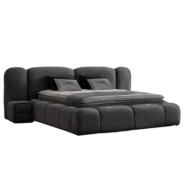 Спалня BUMBY е въплъщение на модерния лукс – изваяна в силует, напомнящ облак, с меки обгръщащи бордове и изискана тапицерия от висококачествена дамаска. Впечатлява не само с естетика, но и с функционалност – включен е умерено мек матрак, подматрачна рамка с амортисьори и практична ракла за съхранение. Съчетава комфорт и изтънчен дизайн, превръщайки всяка спалня в пространство за релакс и вдъхновение. Чудесно се допълва с нощното шкафче от серията.