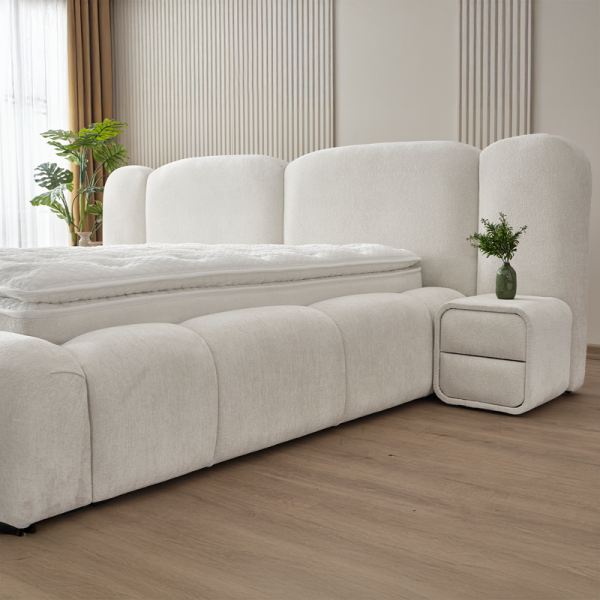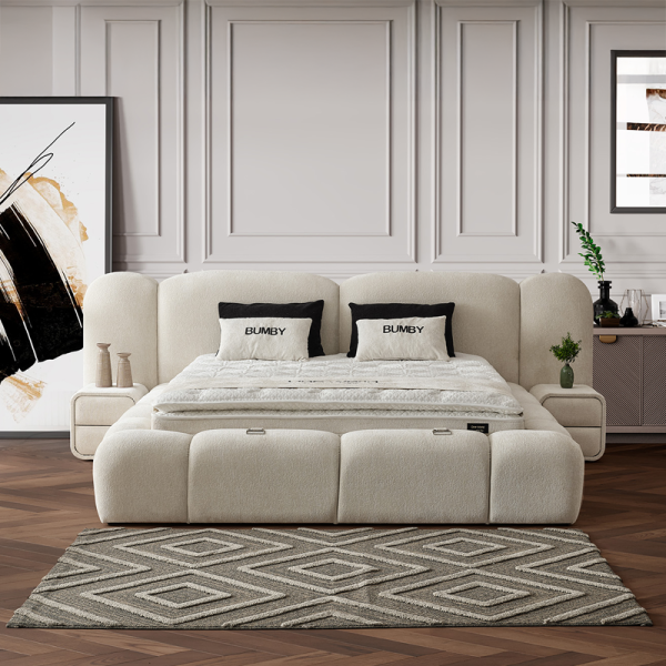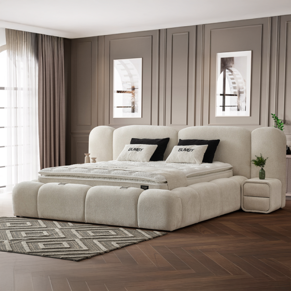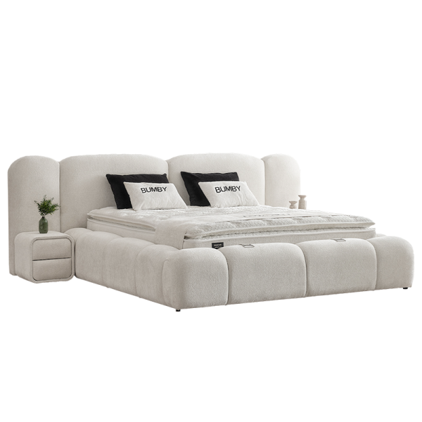 Спалнята BUMBY е елегантно и функционално решение, което внася модерен стил и усещане за чистота в интериора. Моделът е изработен със стабилна метална конструкция, съчетана с МДФ и ПДЧ, като цялата повърхност е тапицирана с качествена дамаска в класическо бяло. В комплекта е включен умерено твърд матрак с бонел пружини, допълнен от пухена подложка и вложки от вълна и памук за оптимален комфорт. Подсилената метална подматрачна рамка позволява лесен достъп до практична ракла за съхранение на багаж, оптимизирайки пространството в помещението.
