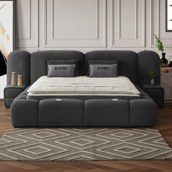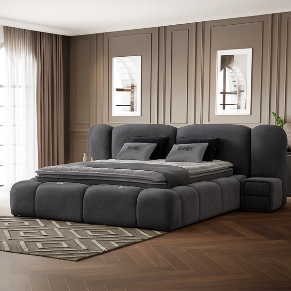 Спалнята BUMBY е елегантно и функционално решение, което внася модерен стил и усещане за чистота в интериора. Моделът е изработен със стабилна метална конструкция, съчетана с МДФ и ПДЧ, като цялата повърхност е тапицирана с качествена дамаска в класическо бяло. В комплекта е включен умерено твърд матрак с бонел пружини, допълнен от пухена подложка и вложки от вълна и памук за оптимален комфорт. Подсилената метална подматрачна рамка позволява лесен достъп до практична ракла за съхранение на багаж, оптимизирайки пространството в помещението.