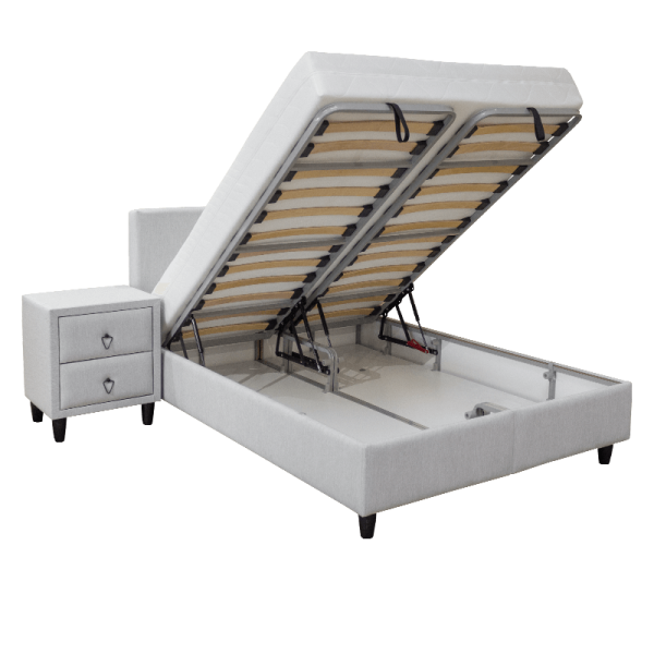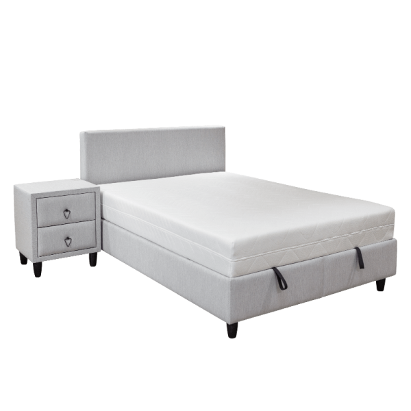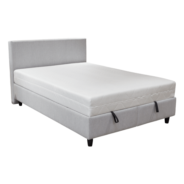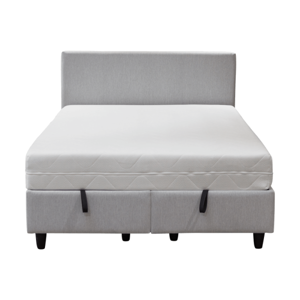 GRASSE е тапицирана спалня с матрак, с размери 160 х 200 см и височина 22 см. Той е умерено мек и съставен от 7-зонов пакет от покет пружини, вложка от вълна и памук и пухена подложка. Моделът притежава амортисьор, с който безпроблемно може да вдигнете матрака и да приберете за съхранение вашите вещи в раклата, която се намира под него. За максимална издръжливост спалнята има подсилена метална рамка.