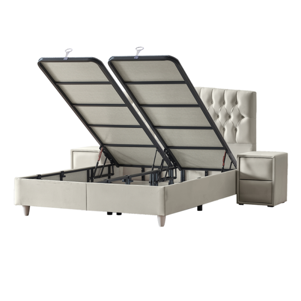 Спалнята Monza е луксозно и цялостно решение за съвременната спалня, съчетаващо комфорт и функционалност. Моделът се отличава със стабилна конструкция, изцяло тапициранa с висококачествена дамаска. В комплекта е включен умерено твърд матрак с Бонел пружини, допълнен от пухена подложка и вложка от вълна и памук за оптимален терморегулация и удобство. Подсилената метална подматрачна рамка разкрива обемна ракла за съхранение, осигуряваща практично използване на пространството под леглото.