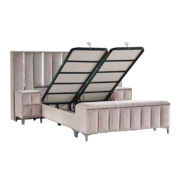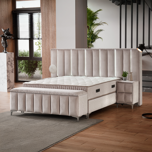 Тапицирана спалня с матрак MOONLIGHT впечатлява с комбинацията от стил, комфорт и модерни функционалности. Моделът се отличава с висока тапицирана табла с вертикален релеф и вградени LED светлини по цялата ѝ височина, които създават приятно осветление и уютна атмосфера. Интегрираният USB порт добавя удобство, позволявайки зареждане на устройства директно до леглото. Двулицевият матрак с покет пружини осигурява независима опора и отличен комфорт по време на сън, а добавените слоеве от еластична пяна и пухена вложка предлагат приятно меко усещане, без да компрометират стабилността. В основата на леглото е вградена рафинирана ракла за съхранение, подходяща за подреждане на спално бельо, одеяла и възглавници.