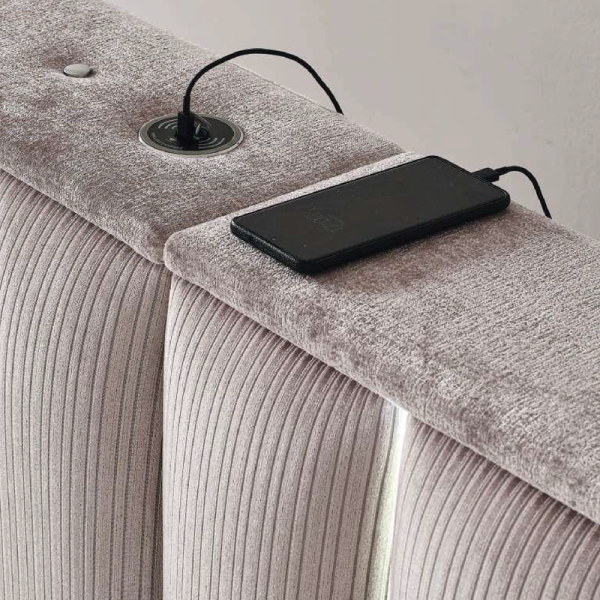 Тапицирана спалня с матрак MOONLIGHT в топъл бежов цвят съчетава луксозна визия и функционален комфорт, като се откроява с внушителна тапицирана табла с вертикален релеф и вградени LED светлини по цялата височина. Моделът създава уникално усещане за простор, светлина и стил – перфектен акцент за всяка съвременна спалня. За още по-голямо удобство, в конструкцията е интегриран и USB порт, идеален за зареждане на устройства до леглото. Матракът е двулицев и изработен с покет пружини, които осигуряват независима опора за всяка част от тялото. Слой от еластична пяна и мека пухена вложка допринасят за по-меко усещане при допир, без да правят леглото прекалено меко – балансирано решение за комфорт и поддръжка. Подматрачната рамка е стабилна и включва удобна ракла за съхранение, в която можете да подредите одеяла, възглавници и други вещи.