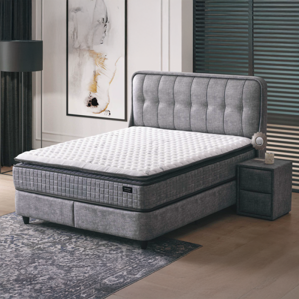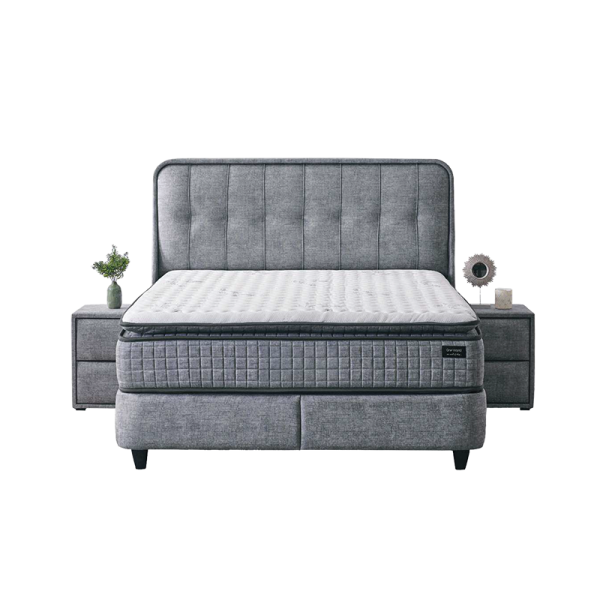 Тапицирана спалня с матрак PICASSO 160 x 200 е стилна интерпретация на класическата визия с модерен привкус. Таблата с мека тапицерия и прави вертикални линии придава усещане за симетрия и уют, а заоблените ъгли омекотяват формата и допринасят за хармоничния силует на модела. Матракът е двулицев, с покет пружини, еластична пяна и пухена вложка, като се отличава с твърда структура и изразени ортопедични свойства – идеален за почитателите на стабилна опора и здравословна позиция по време на сън. Под него се намира стабилна подматрачна рамка с ракла за съхранение, осигуряваща дискретно и практично място за подреждане.