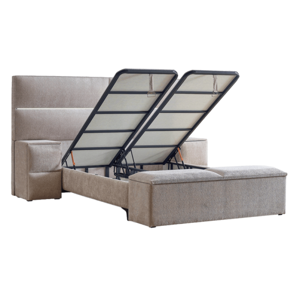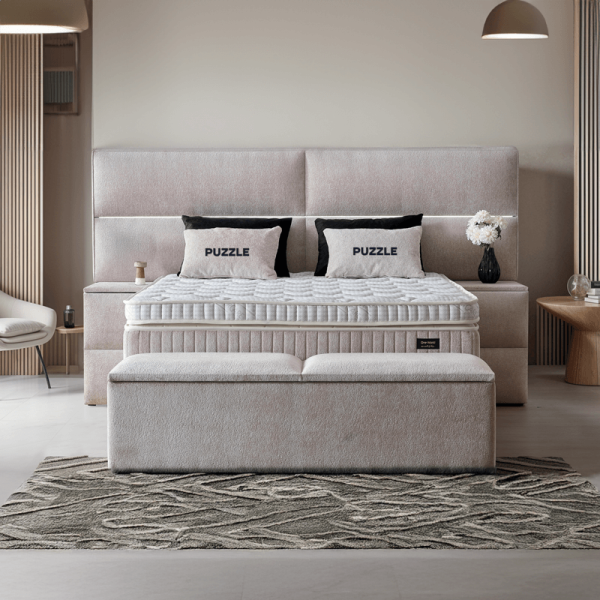 Тапицирана спалня с матрак PUZZLE 160 x 200 е стилен избор за всяка модерна спалня, съчетаващ елегантна визия с внимание към детайла. Високата табла с мека тапицерия и хоризонтален декоративен шев създава усещане за простор и хармония, а вградената LED светлина в централната линия придава фин завършек и уютна атмосфера. Моделът включва двулицев матрак с покет пружини, еластична пяна и пухена вложка, които осигуряват меко и приятно усещане при сън, съчетано с точкова поддръжка за тялото. Под стабилната подматрачна рамка се намира просторна ракла за съхранение – практично решение за подреденост в ежедневието. Моля, имайте предвид, че пейката и нощните шкафчета, показани на снимката, не са включени в цената.