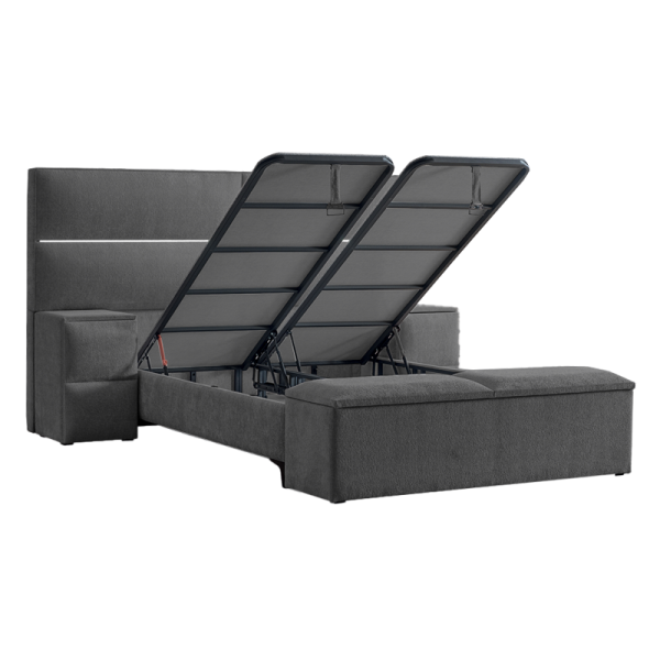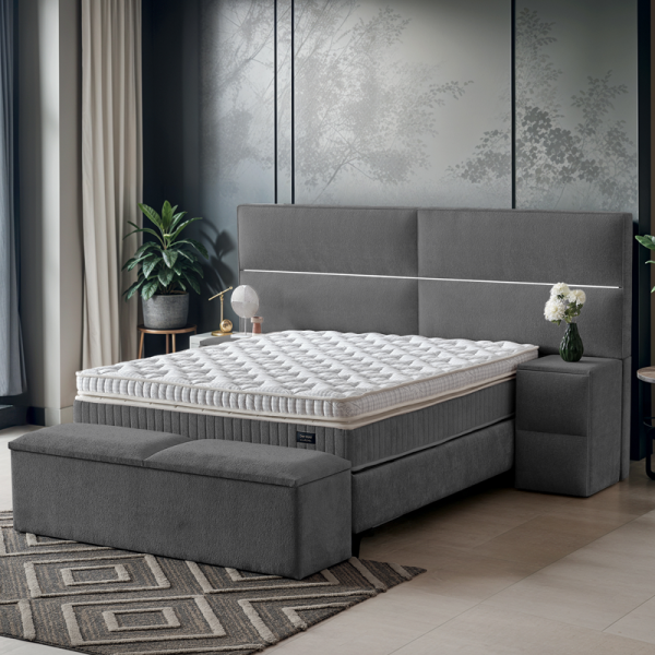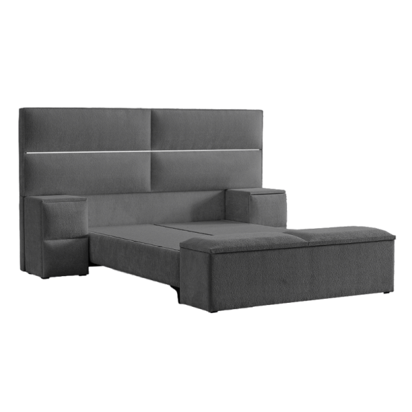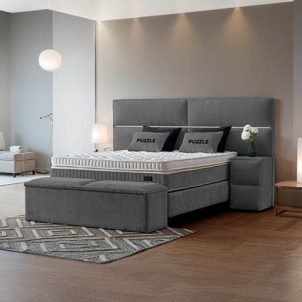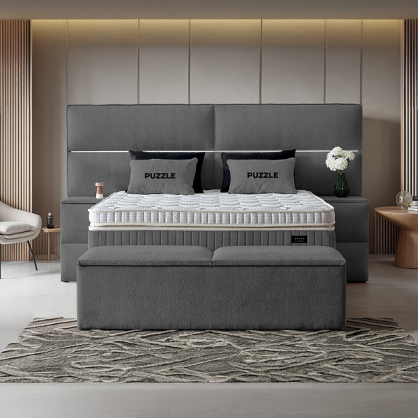 Тапицирана спалня с матрак PUZZLE 160 x 200 е стилен избор за всяка модерна спалня, съчетаващ елегантна визия с внимание към детайла. Високата табла с мека тапицерия и хоризонтален декоративен шев създава усещане за простор и хармония, а вградената LED светлина в централната линия придава фин завършек и уютна атмосфера. Моделът включва двулицев матрак с покет пружини, еластична пяна и пухена вложка, които осигуряват меко и приятно усещане при сън, съчетано с точкова поддръжка за тялото. Под стабилната подматрачна рамка се намира просторна ракла за съхранение – практично решение за подреденост в ежедневието. Моля, имайте предвид, че пейката и нощните шкафчета, показани на снимката, не са включени в цената.