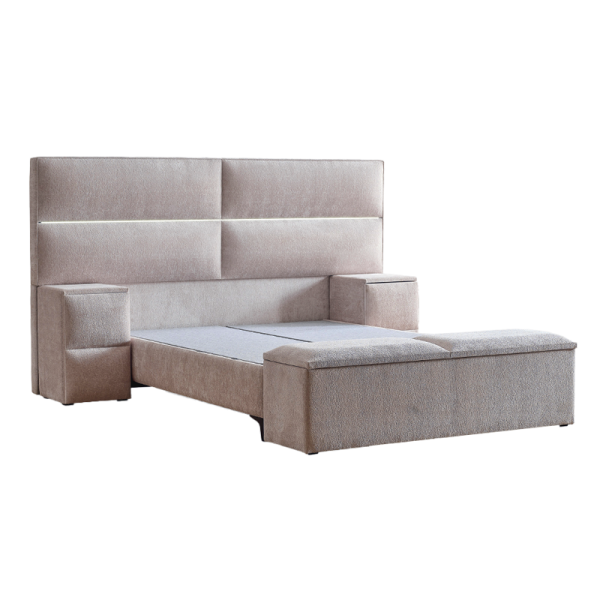 Тапицирана спалня с матрак PUZZLE 180 х 200 е изискано предложение за модерния дом, което впечатлява с прецизна изработка и стилна визия. Таблата е висока, тапицирана с мек плат и украсена с хоризонтален декоративен шев, който придава усещане за подреденост и простор. Дискретната LED лента, вградена по средата на таблата, създава топла и спокойна атмосфера в интериора. Включеният двулицев матрак е с покет пружини, еластична пяна и пухена вложка, които предлагат приятно меко усещане и добра точкова поддръжка на тялото. Под леглото е предвидена просторна ракла за съхранение, подходяща за организиране на спално бельо и други вещи. Моля, имайте предвид, че пейката и нощните шкафчета, показани на изображението, не са част от комплекта и не са включени в цената.