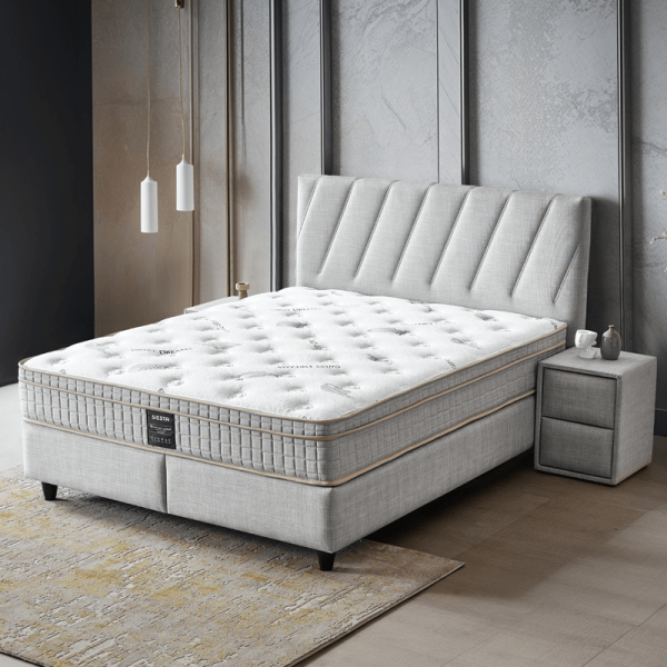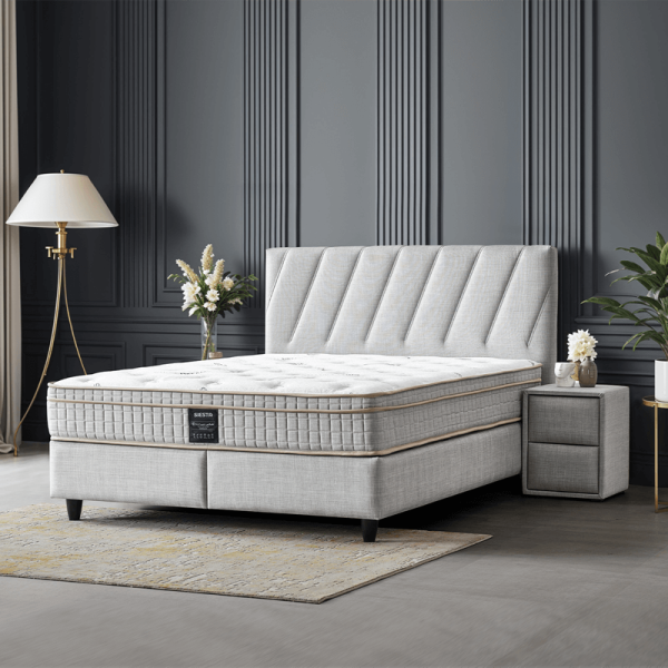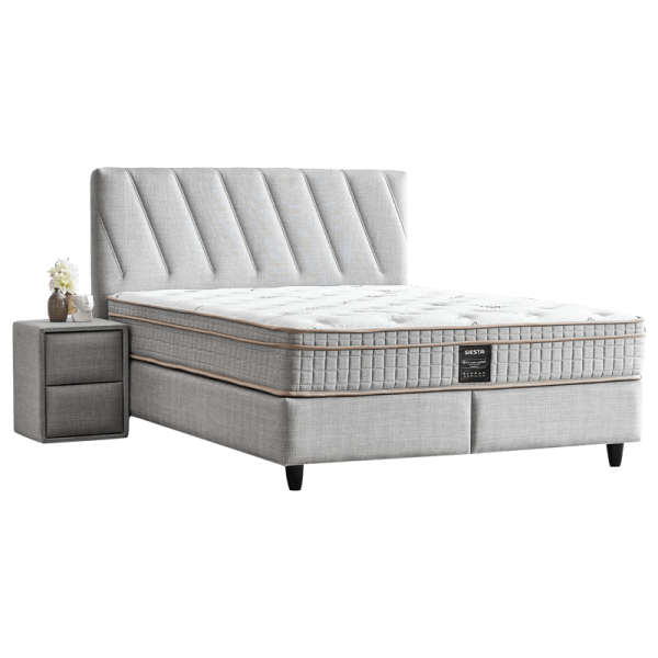 Превърнете спалнята си в истинско място за почивка със стилната и функционална тапицирана спалня с матрак SIESTA 160 x 200, която съчетава елегантна визия, комфорт и удобство в едно. Моделът впечатлява с мека текстилна дамаска в светло сив цвят и изчистена табла с нежни шевове, която придава усещане за лекота и уют. Спалня SIESTA е оборудвана с двулицев матрак с вградена подматрачна рамка, който осигурява стабилна и комфортна опора благодарение на бонел пружините, еластичната пяна и пухената вложка. Матракът е с умерено твърда структура и добри ортопедични свойства, подходящ за всекидневна употреба. Под леглото се крие практична ракла за съхранение – идеално решение за подреждане на спално бельо и други вещи.