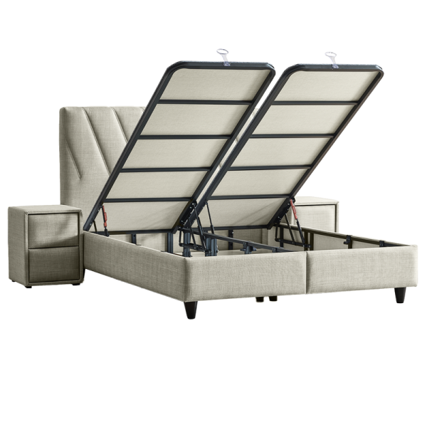 Тапицирана спалня с матрак SIESTA 180 x 200 превръща всяка спалня в оазис на комфорт и спокойствие. Моделът съчетава елегантна визия и функционален дизайн, като впечатлява с мека текстилна дамаска в светлосив нюанс и изчистена табла с фини декоративни шевове, които внасят усещане за лекота и уют. В комплекта е включен двулицев матрак с вградена подматрачна рамка, осигуряващ отлична опора благодарение на бонел пружини, еластична пяна и пухена вложка. Матракът предлага умерена твърдост и добри ортопедични качества, подходящи за ежедневно ползване. В основата е разположена практична ракла за съхранение, осигуряваща място за спално бельо и други вещи, като същевременно запазва изчистения облик на леглото.