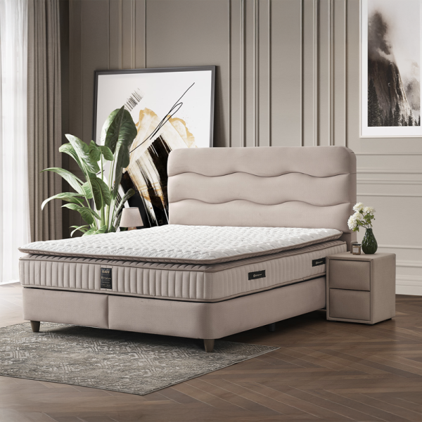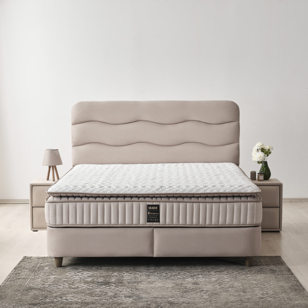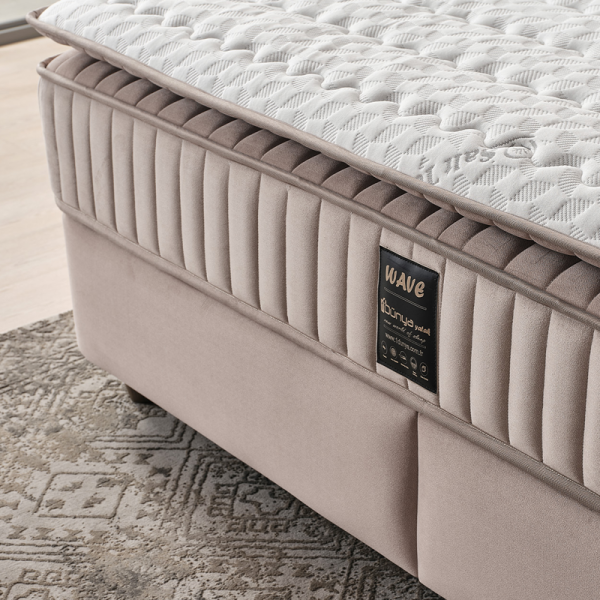 Тапицирана спалня с матрак WAVE 160 x 200 е идеалният избор за спалня, която търси съчетание от мекота, стил и практичност. Със своята тапицирана табла с вълнообразен силует и нежна светлина от вграденото LED осветление, моделът внася усещане за лукс и спокойствие. Текстилната дамаска в елегантен светъл тон е не само естетична, но и pet friendly – устойчива на надраскване и разнищване от лапи, което я прави отличен избор за домове с домашни любимци. Включеният двулицев матрак с вградена подматрачна рамка разчита на индивидуално опаковани покет пружини, еластична пяна и пухена вложка, които осигуряват отлична адаптивност към тялото и независима опора за двама. Матракът е със стегната структура и добри ортопедични свойства за качествен и спокоен сън. Практичната ракла под матрака предлага допълнително място за съхранение на завивки и текстил. Пейката и нощните шкафчета не са включени в цената.
