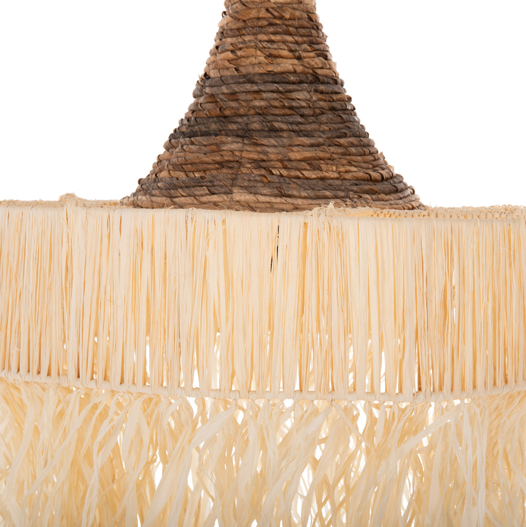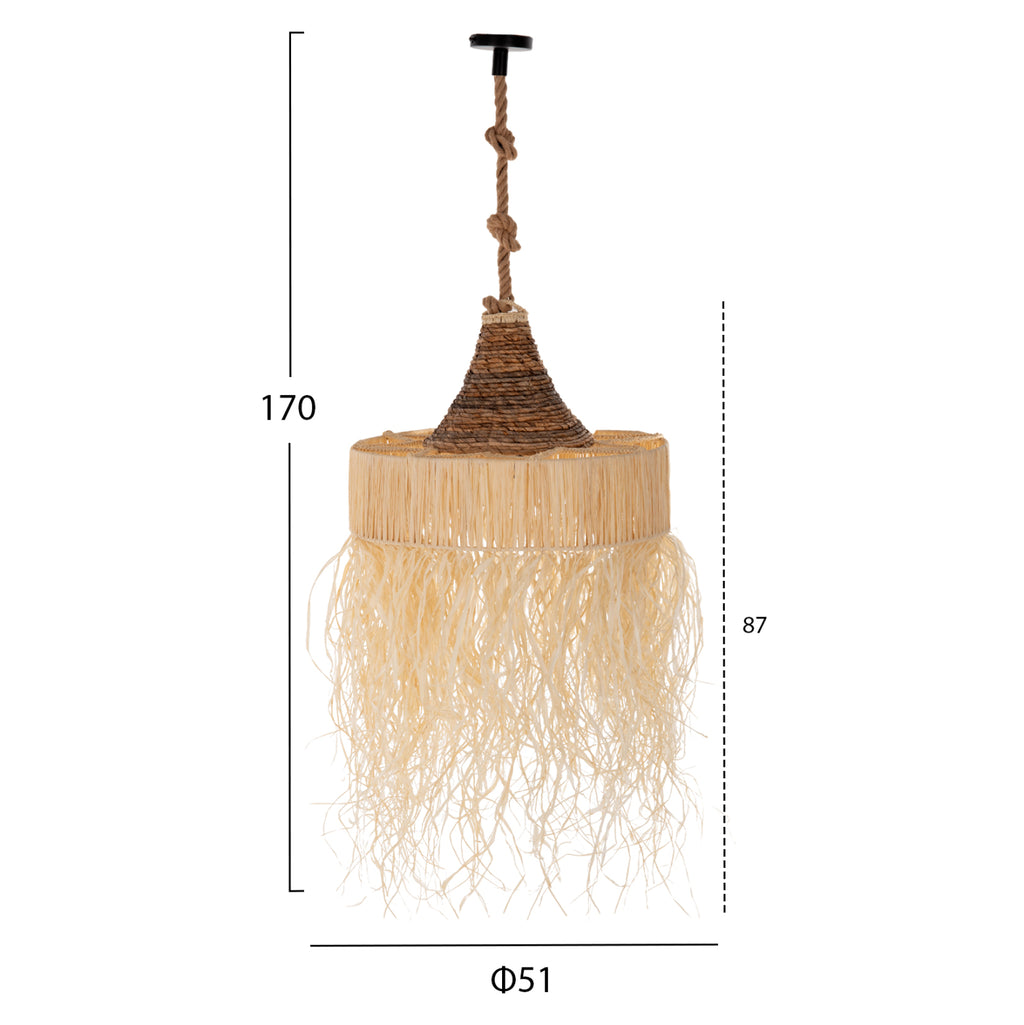 КГ11922- Пендел---- Ако искате да украсите вашето пространство с лампа в бохо стил с екзотични материали и да я комбинирате с най-новата тенденция в декорацията, която е въже, това е най-добрият избор. Представлява единична лампа с цилиндрична "шапка" от влакна на палмови листа с ресни, в НАТУРАЛЕН цвят. Въжето, на което се окачва от тавана, е прикрепено към дръжката за окачване на тази лампа.