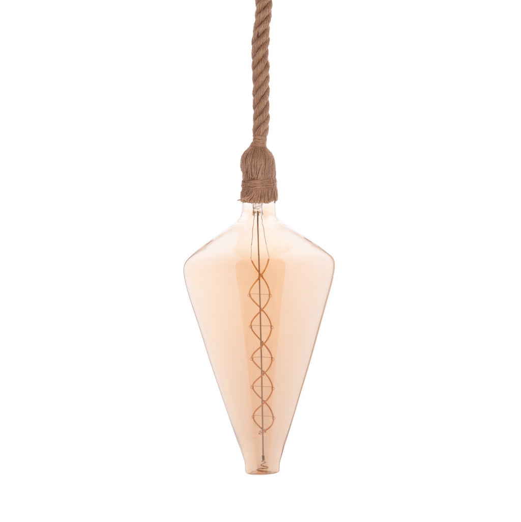 Искате ли да се откроите и да създадете напълно различно усещане във вашия дом или бизнес? Тази красиво проектирана таванна лампа с единична лампа, висяща на въже и абажурът, ПОКРИТ от това въже, със сигурност ще привлече всички погледи и ще започне разговор. Просто го оставете да виси или направете възел, както желаете, за да можете да придадете своя личен щрих на пространството. В крайна сметка това трябва да е една от основните характеристики на осветлението. Да отразява характера и личността на собственика! Осветлението е бижуто на вашия дом или бизнес пространство. ТЕХНИЧЕСКИ ХАРАКТЕРИСТИКИ: Тип на държача на лампата: E27 Нормален цокъл Лампа: LED С НИШКА 8W E27 3000K ЗЛАТЕН ЦВЯТ ПРОЗРАЧНО ДИМИРУВАНЕ- Лумени: 560 Обща височина (включително абажура): 108 см (регулируема в зависимост от това какво искате да правите с въжето) Само дължина на въжето: 1 м Дебелина на въжето: 2 cm. Лампата има CE сертификат. МАТЕРИАЛИ НА КОНСТРУКЦИЯТА: Лампата е изработена от въже, а таванът е метален. **СВЕТЛИНАТА Е НАЛИЧНА С КОНКРЕТНАТА КРУШКА