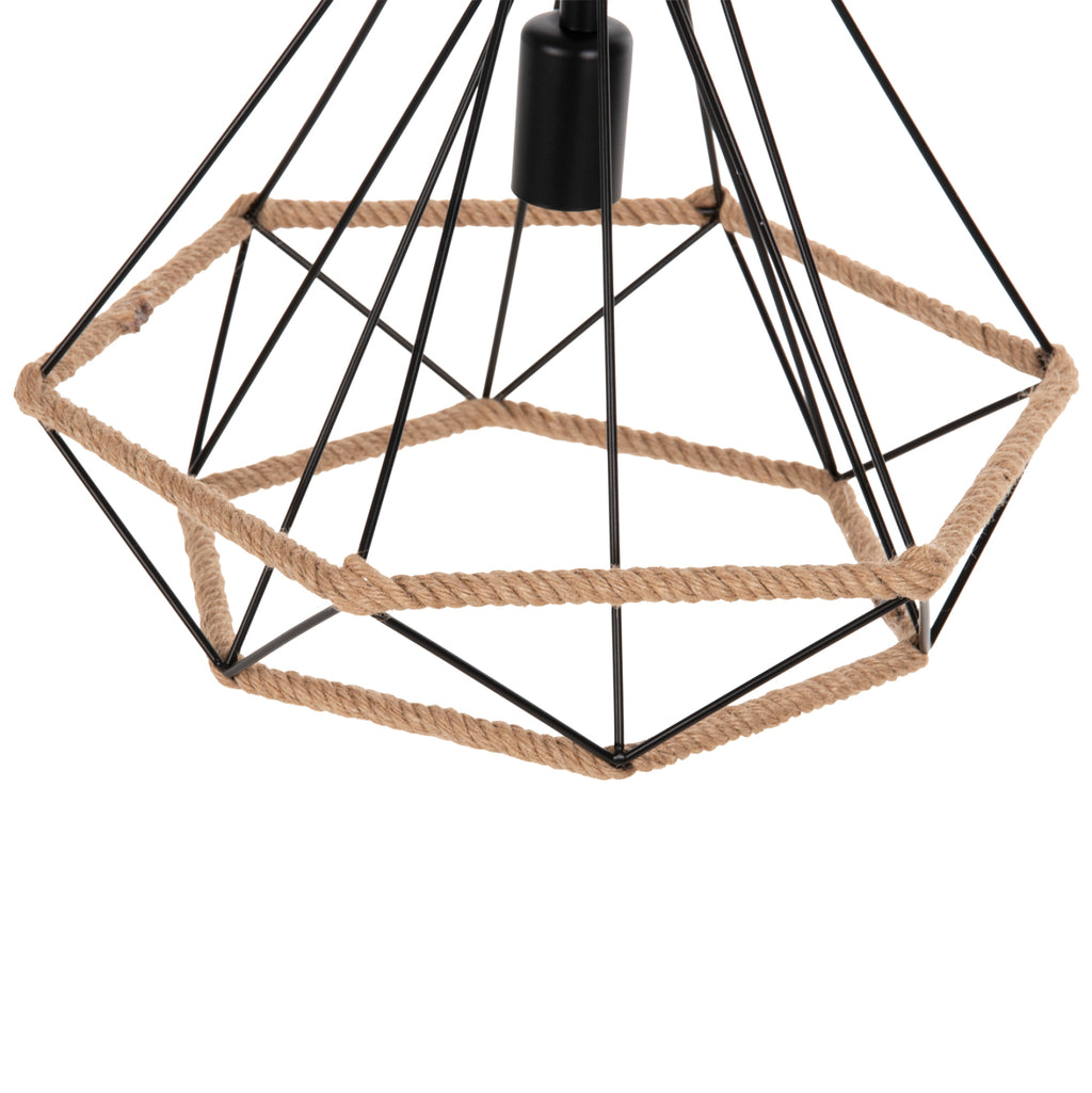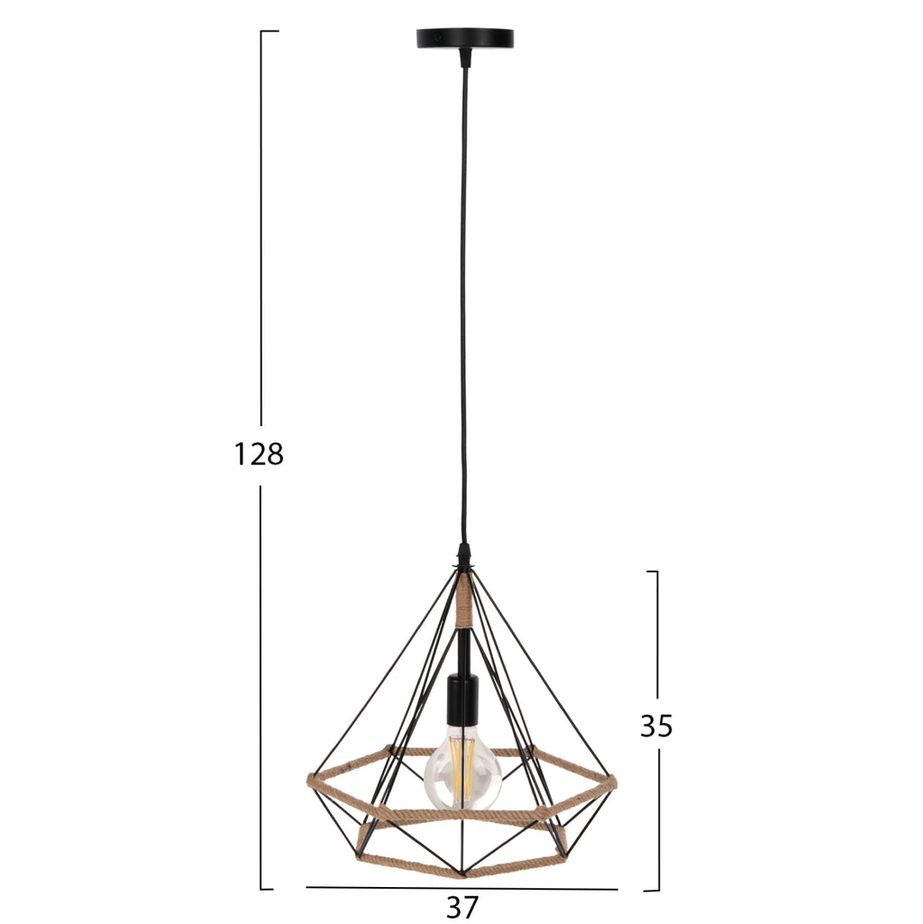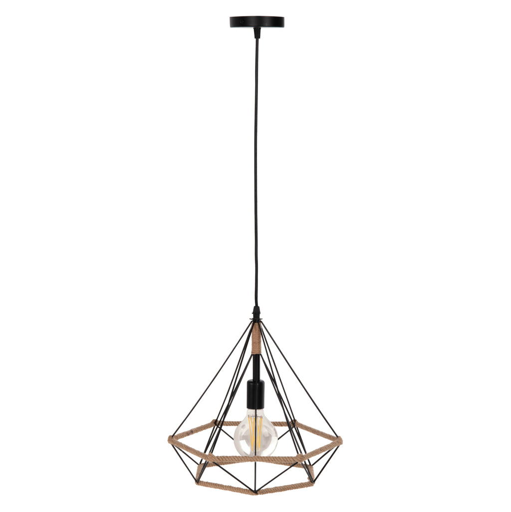 Оставете светлината да се разпространи в пространството с оригинална и елегантна висяща единична плафониера, завършваща вашата декорация. Диамантената форма с ЧЕРНИ метални пръти и въже е олицетворение на модерния дизайн. ТЕХНИЧЕСКИ ХАРАКТЕРИСТИКИ: Цокъл на крушка: Е27 Цокъл с обикновена крушка Тип на крушката: Препоръчителна LED 20w Размери на цокъла: 33х37см. Височина на шапката: 35см. Обща височина: 128 см. (включително висящ кабел) МАТЕРИАЛ НА КОНСТРУКЦИЯТА: Целият монолайт е изработен от метал, както и кръглата основа за окачване на тавана. ПОДДРЪЖКА: Най-важното за тази конкретна лампа е редовното й почистване от прах. Ако имате време, разбира се, използвайте влажна кърпа и я направете да изглежда като нова.