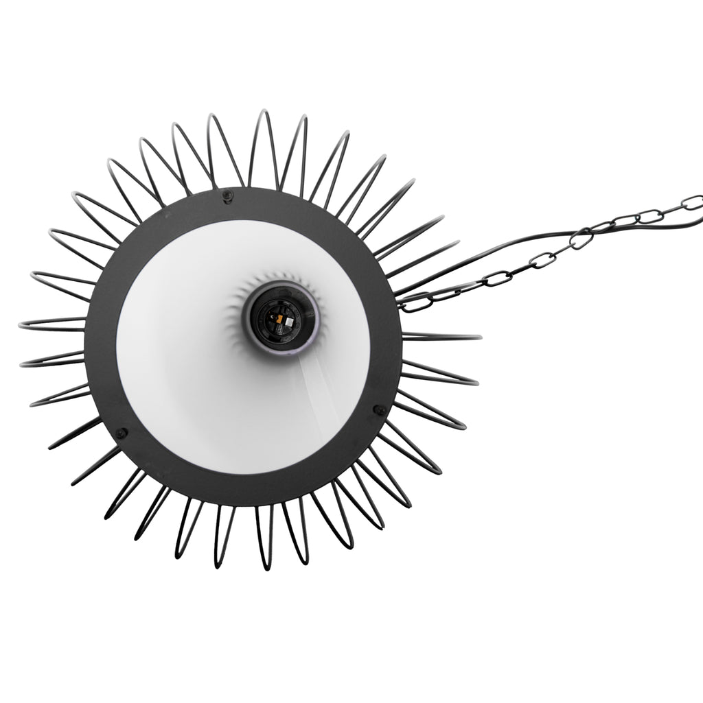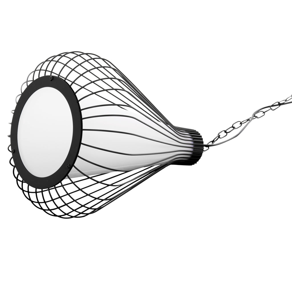 Цялата лампа е изработена от метал, както и кръглата основа за окачване на тавана. Капакът на лампата е изработен от синтетичен плат.