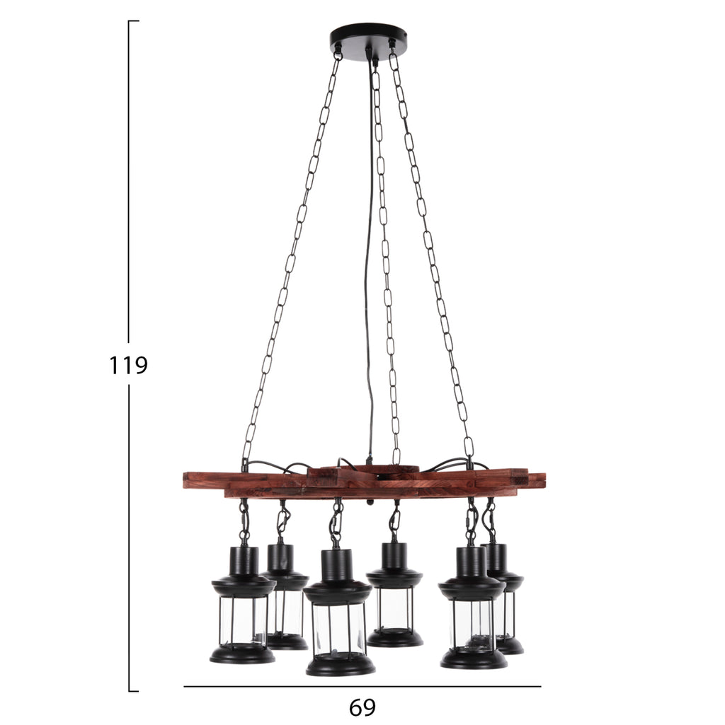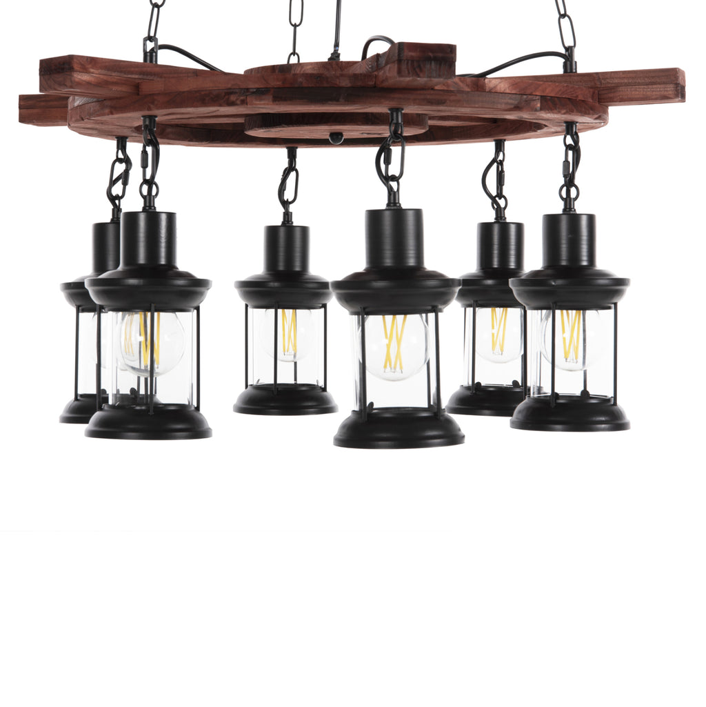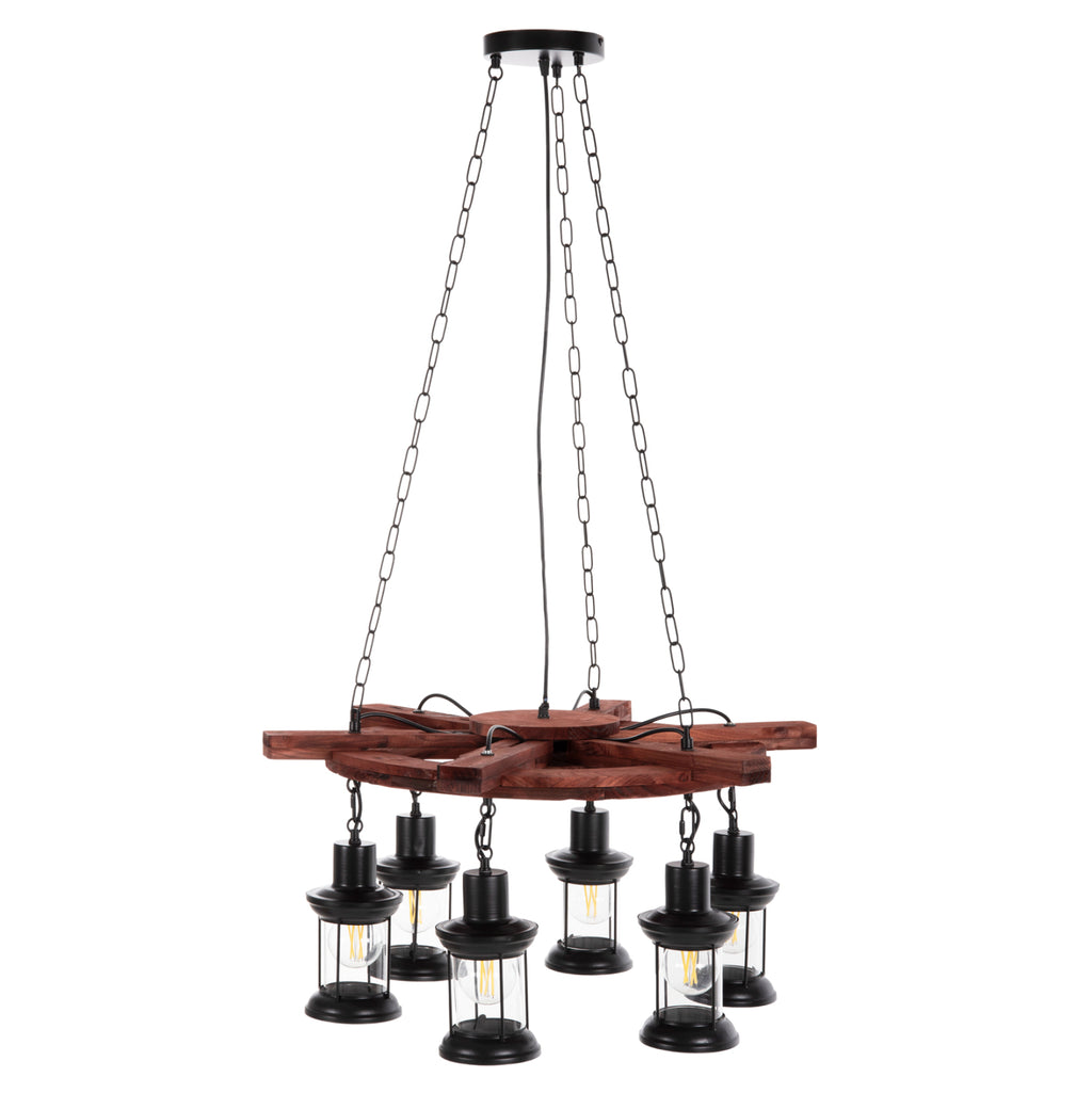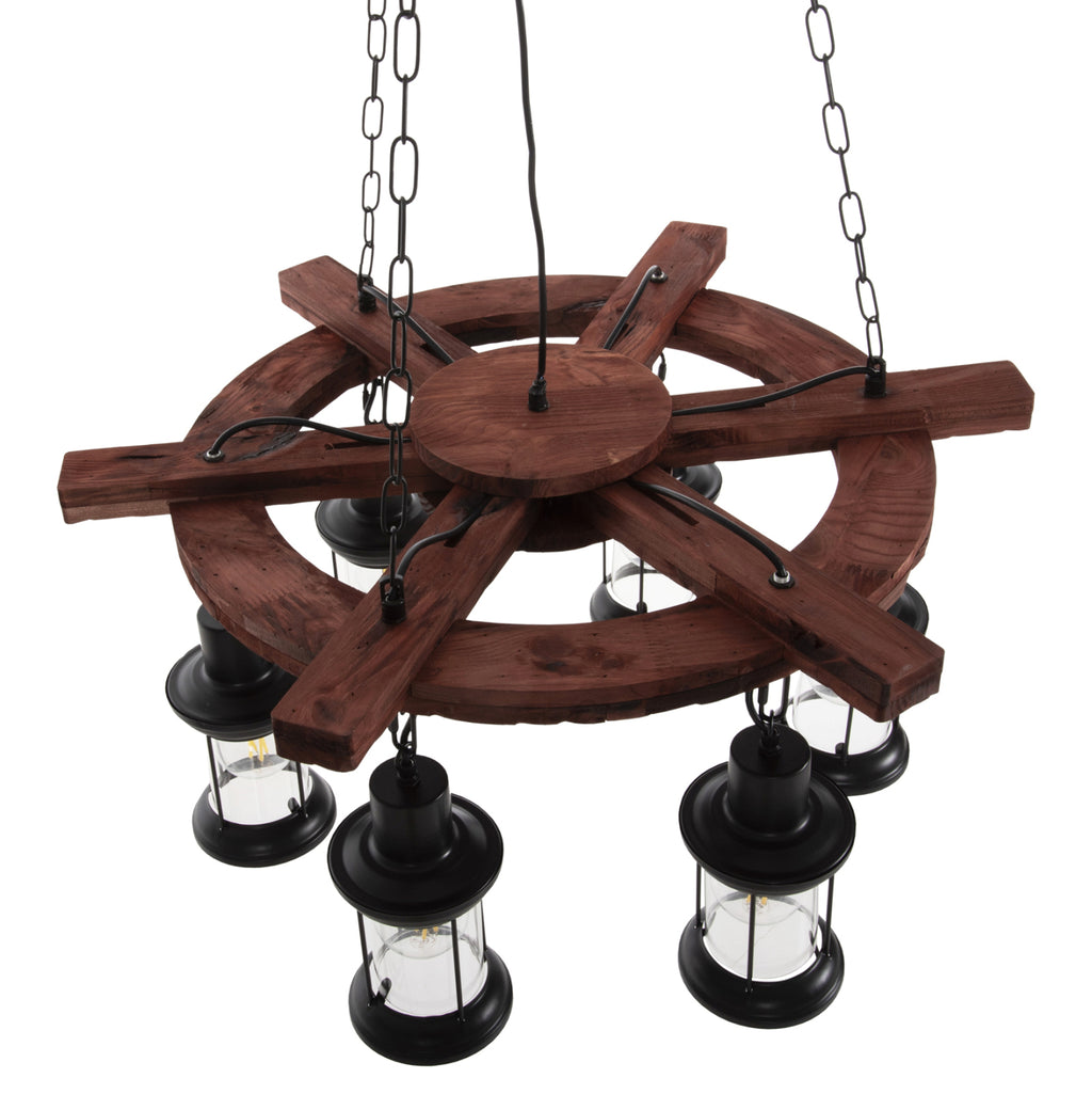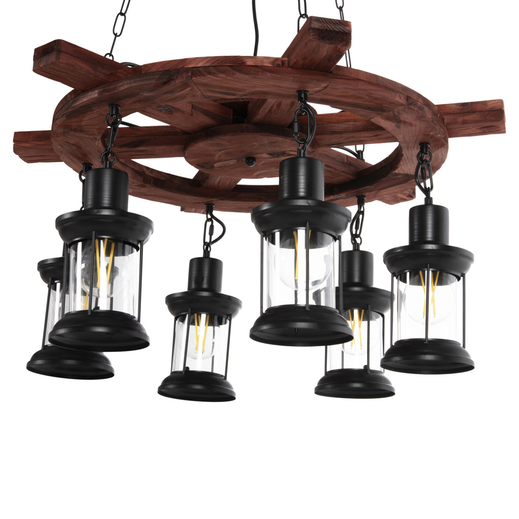 Открийте впечатляващата таванна лампа с 6 лампи КГ4116. Лампа, която ще бъде център на вниманието, благодарение на своя впечатляващ и вдъхновяващ дизайн. 6-те фенера, съдържащи крушките, висят от дървена корабна рулева рубка (рул), която от своя страна виси от тавана с вериги. ТЕХНИЧЕСКИ ХАРАКТЕРИСТИКИ: Цокъл на крушка: E27 Цокъл с обикновена крушка Тип на крушката: Препоръчително е да се използва LED 20w Размери: 69x69x119Y cm. Шапка: 12x12x20.5H см. Основа: 15,5см. Има CE сертификат. ПОДДРЪЖКА: Най-важното за тази лампа е редовното й почистване от прах. Ако имате време, разбира се, използвайте влажна кърпа и я направете да изглежда като нова. *Крушките не са включени в цената ** Цветопредаването на продукта може леко да се различава от фотографското изображение на вашия екран. ***Лампата изисква сглобяване