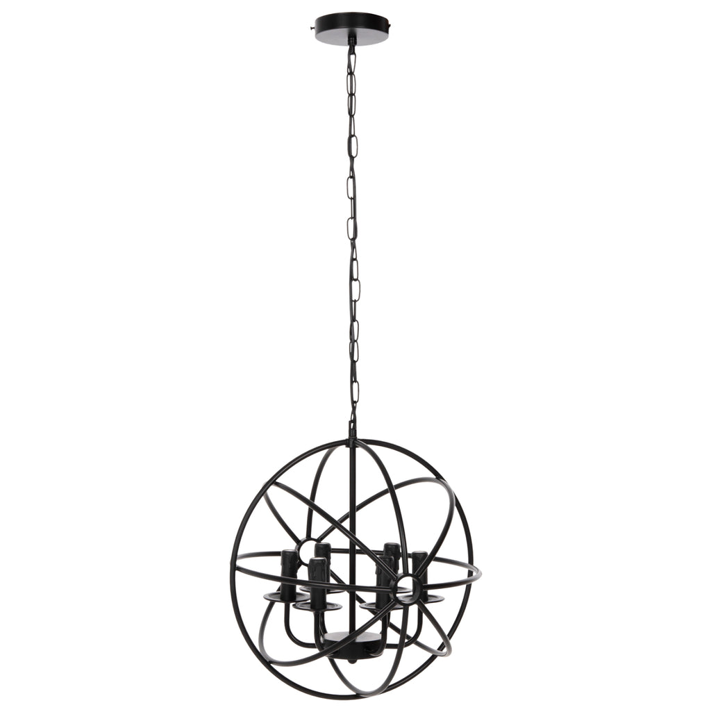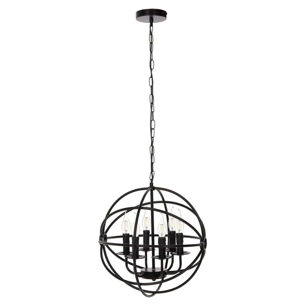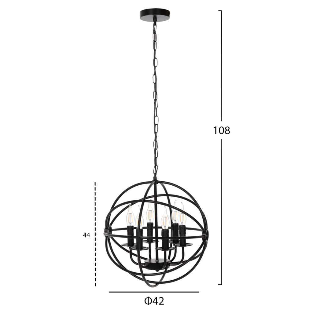Оставете светлината да се разпространи в пространството с оригинална и елегантна 6-светлинна пенделка, която допълва декорацията ви. ЧЕРНАТА метална топка, висяща на верига, е олицетворение на модерния дизайн. ТЕХНИЧЕСКИ ХАРАКТЕРИСТИКИ: Цокъл на крушка: E27 Цокъл с обикновена крушка Тип на крушката: Препоръчва се LED 20w Размери: Φ42x108H cm. Размери на шапката: Φ42x44 см. МАТЕРИАЛ НА ИЗРАБОТКА: Цялата лампа е изработена от метал, както и кръглата основа за окачване на тавана. ПОДДРЪЖКА: Най-важното за тази конкретна лампа е редовното й почистване от прах. Ако имате време, разбира се, използвайте влажна кърпа и я направете да изглежда като нова. *Лампи не са включени в цената